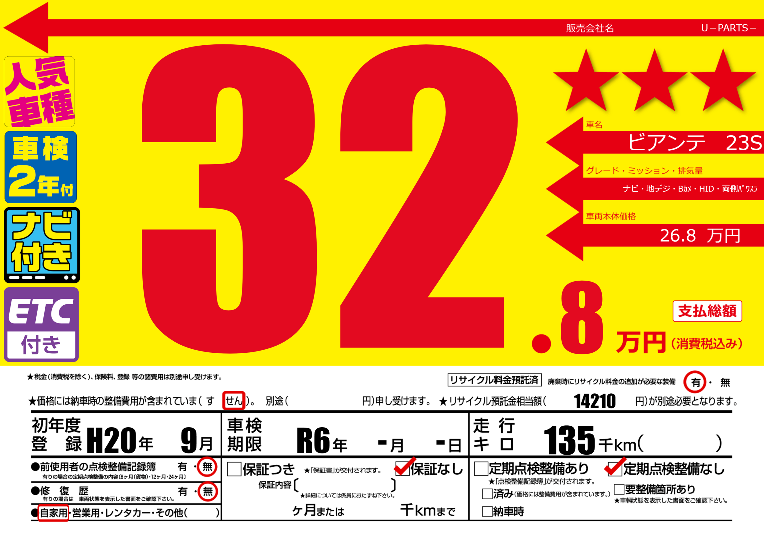 | 車名 | ビアンテ 23S | グレード ミッション 排気量 |
