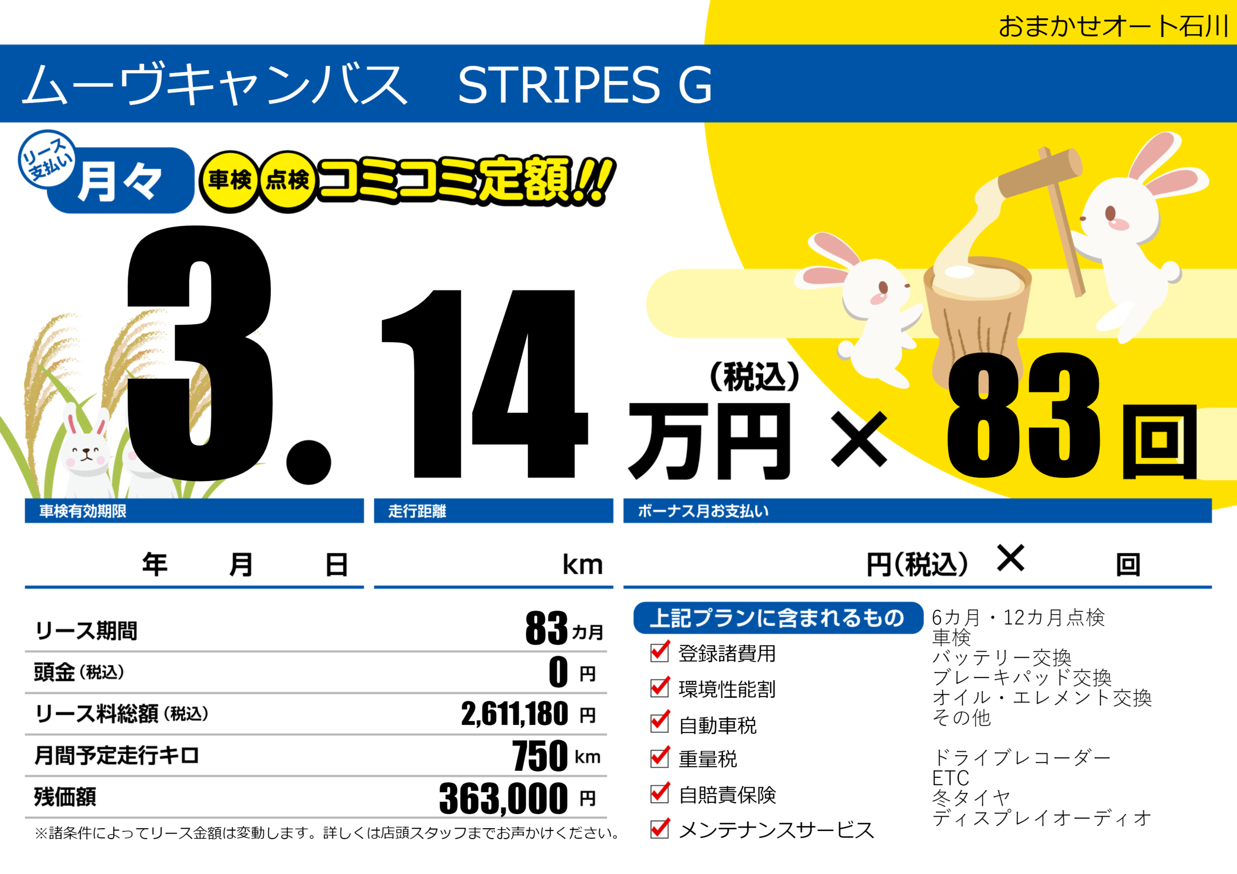 | 車名 | ムーヴキャンバス STRIPES G | グレード ミッション 排気量 |