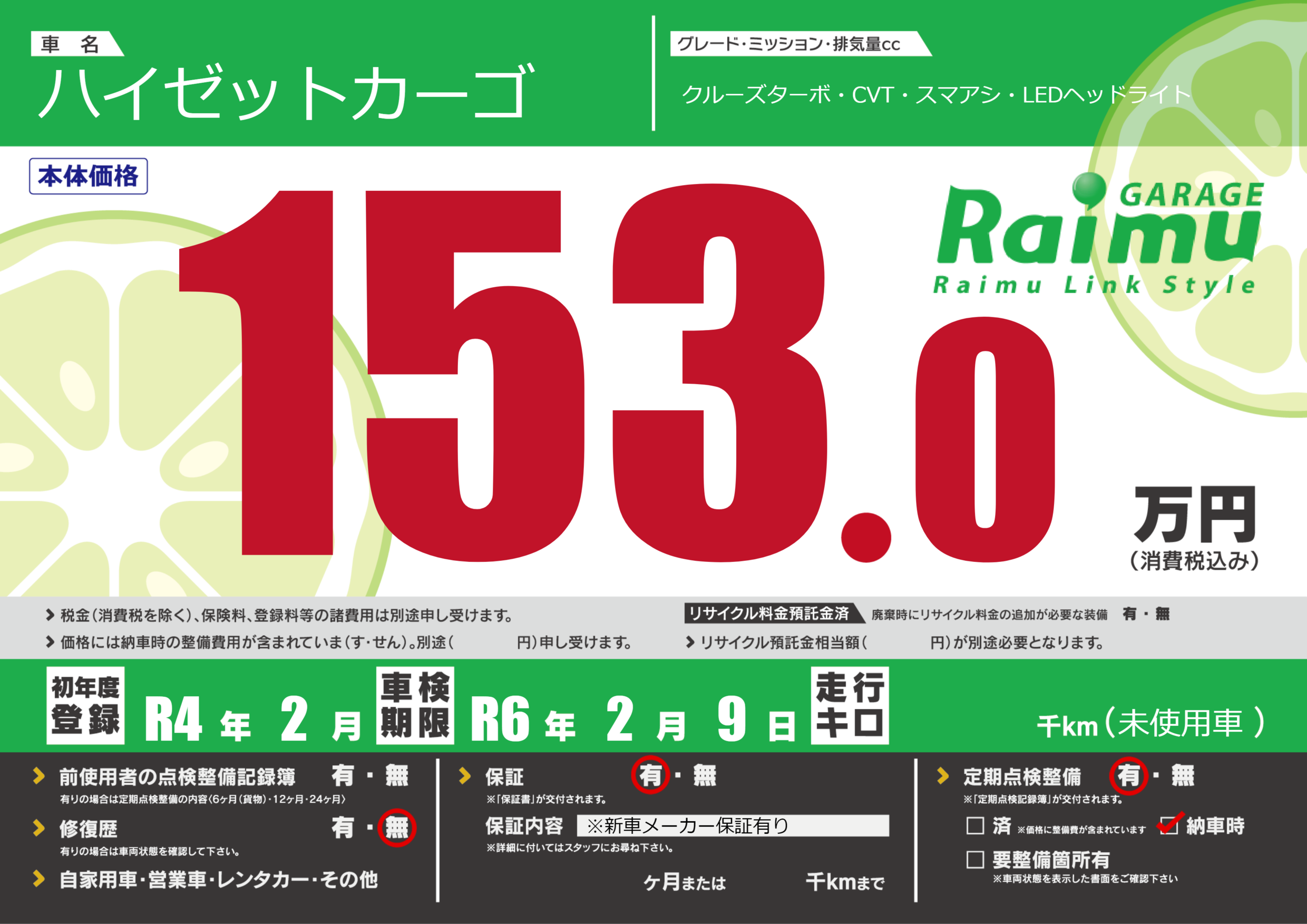 保証付き 保証内容(※新車メーカー保証有り) ヶ月または千km |