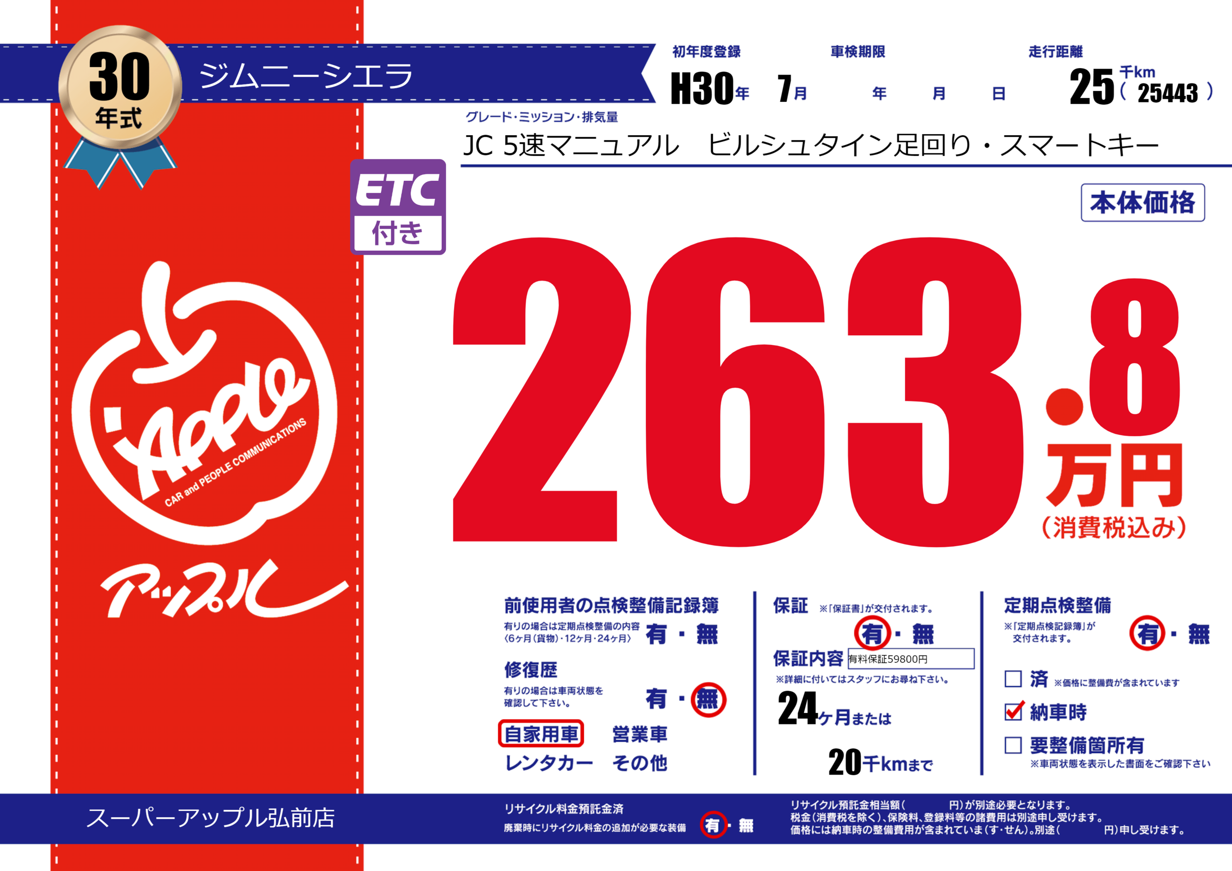 保証付き 保証内容(有料保証59800円) 24ヶ月または(20)千kmまで |