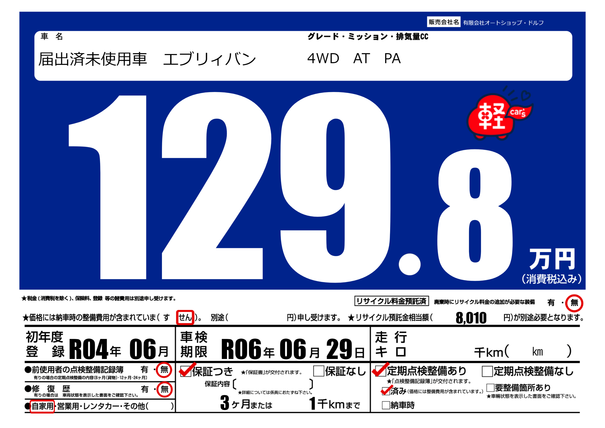 | 車名 | 届出済未使用車 エブリィバン | グレード ミッション 排気量 |