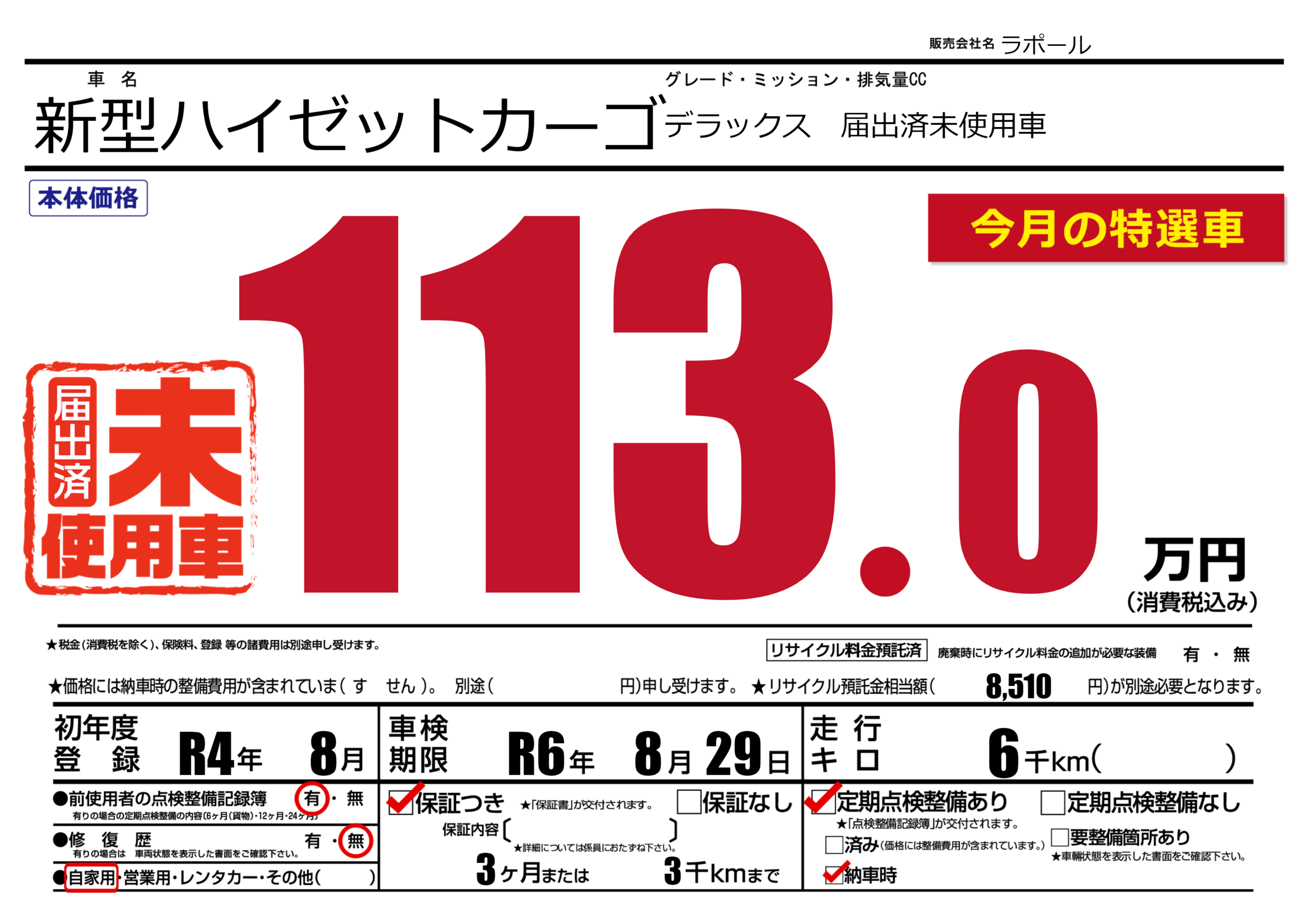| 走行キロ | 0.6万km | 初年度登録 | R4年8月 |
