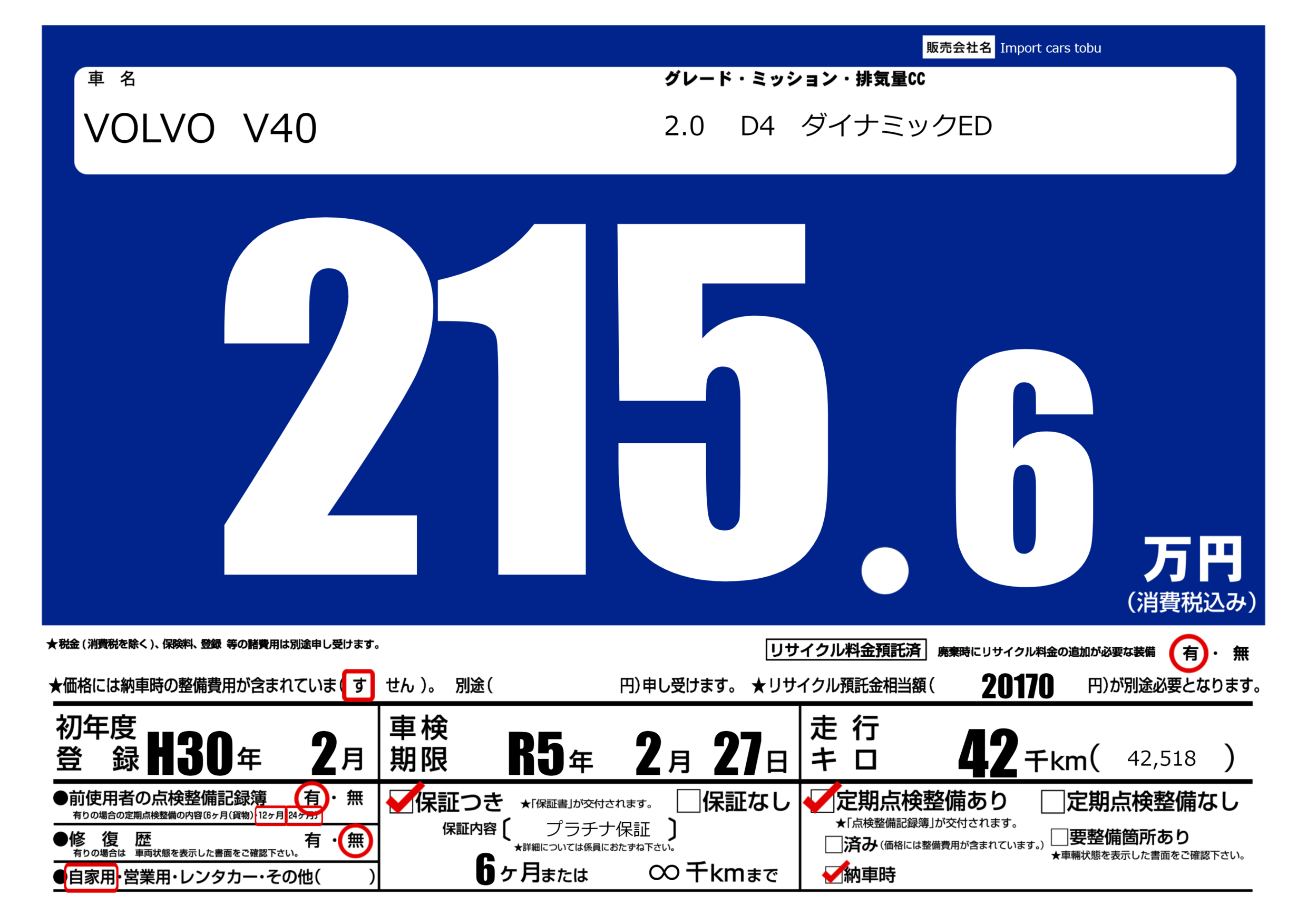 | 車名 | VOLVO V40 | グレード ミッション 排気量 |