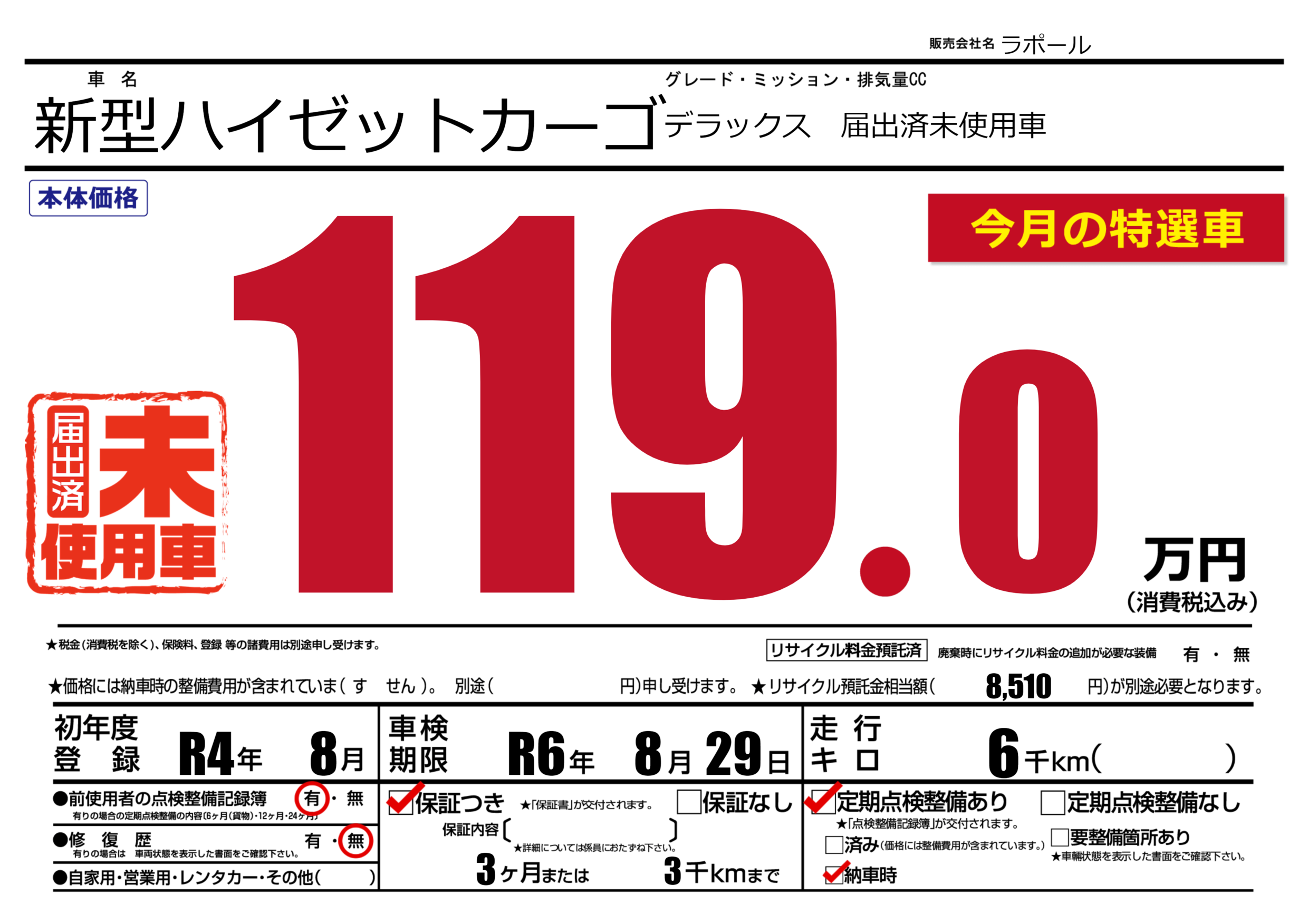 | 走行キロ | 0.6万km | 初年度登録 | R4年8月 |