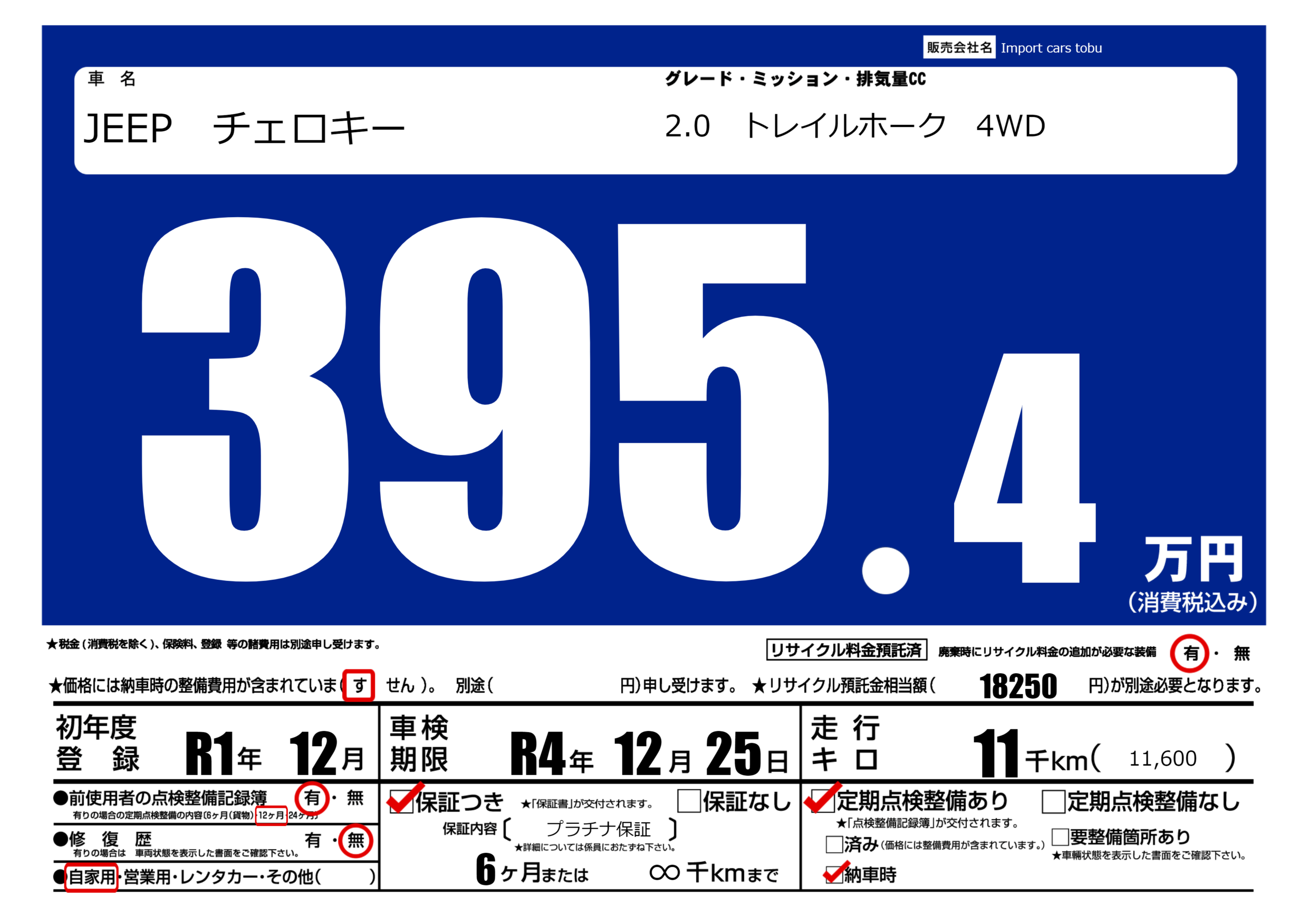 | 車名 | JEEP チェロキー | グレード ミッション 排気量 |