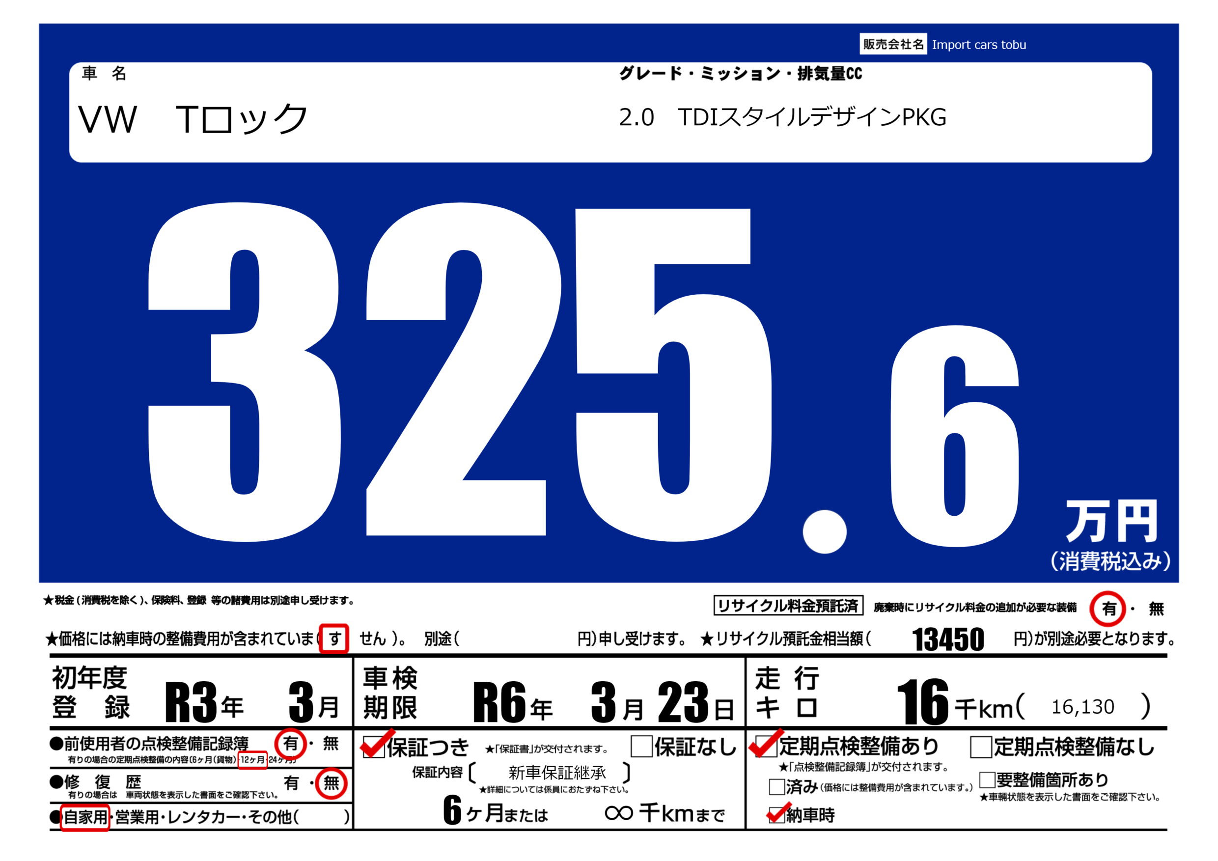 保証付き 保証内容( 新車保証継承) 6ヶ月または(∞)千kmまで |