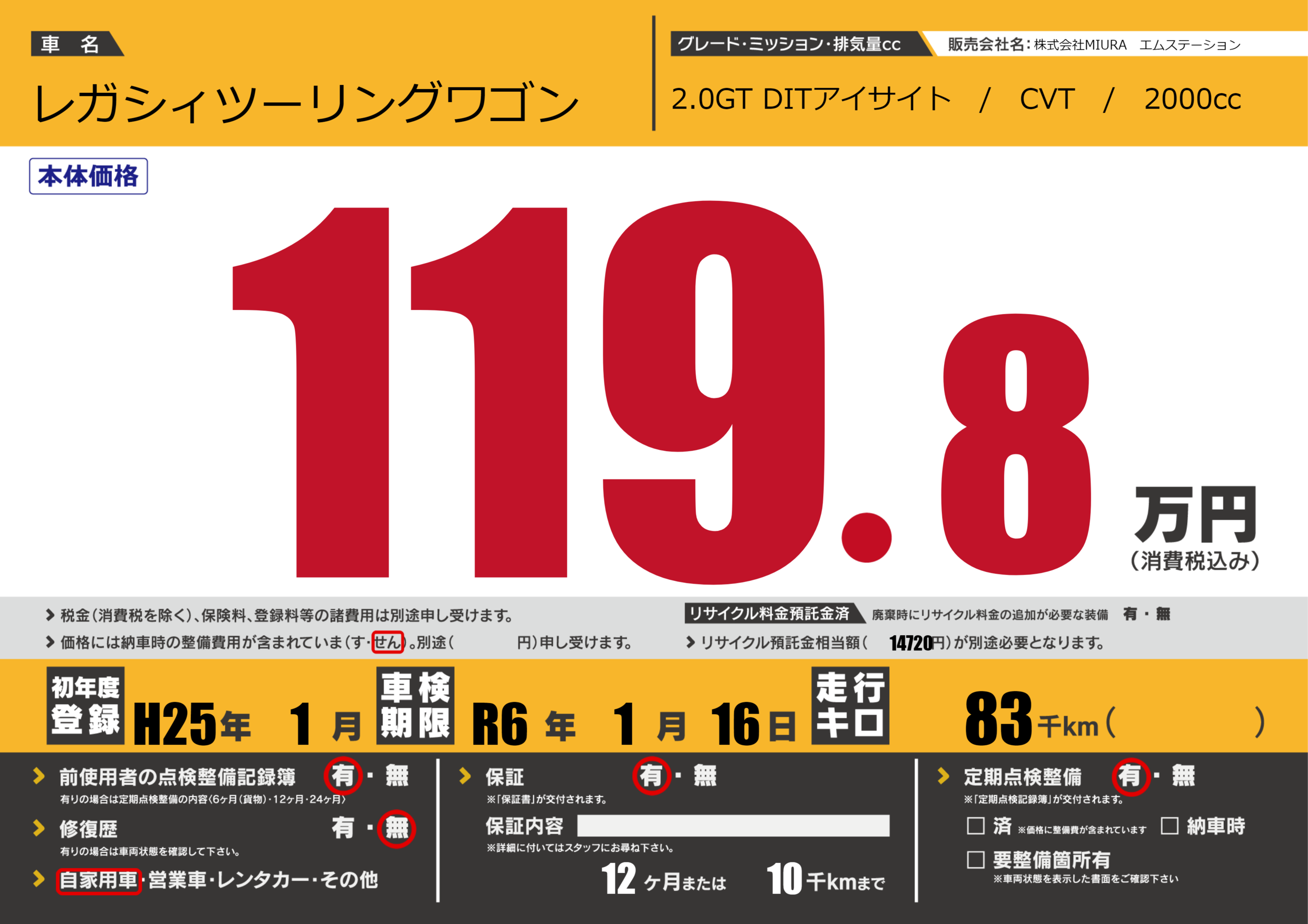 | 車名 | レガシィツーリングワゴン | グレード ミッション 排気量 |
