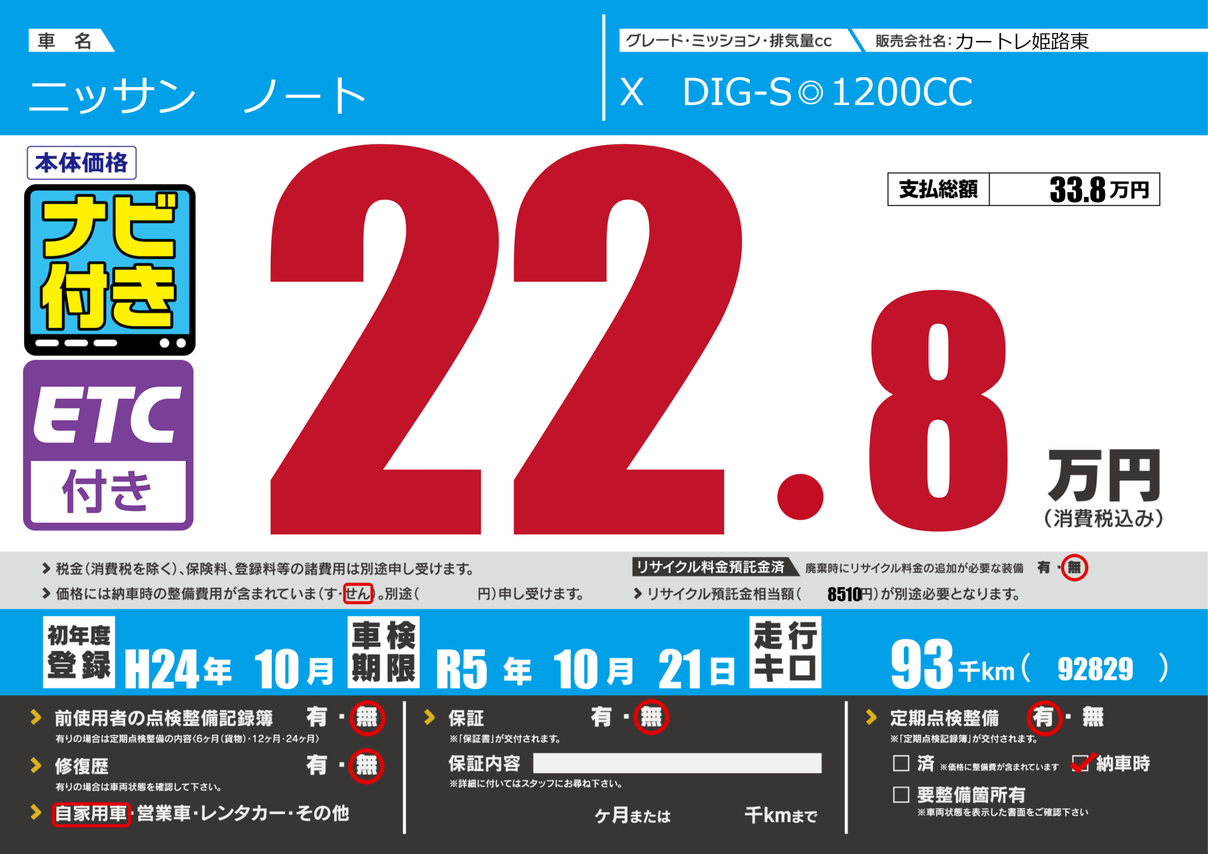 | 車名 | ニッサン ノート | グレード ミッション 排気量 |