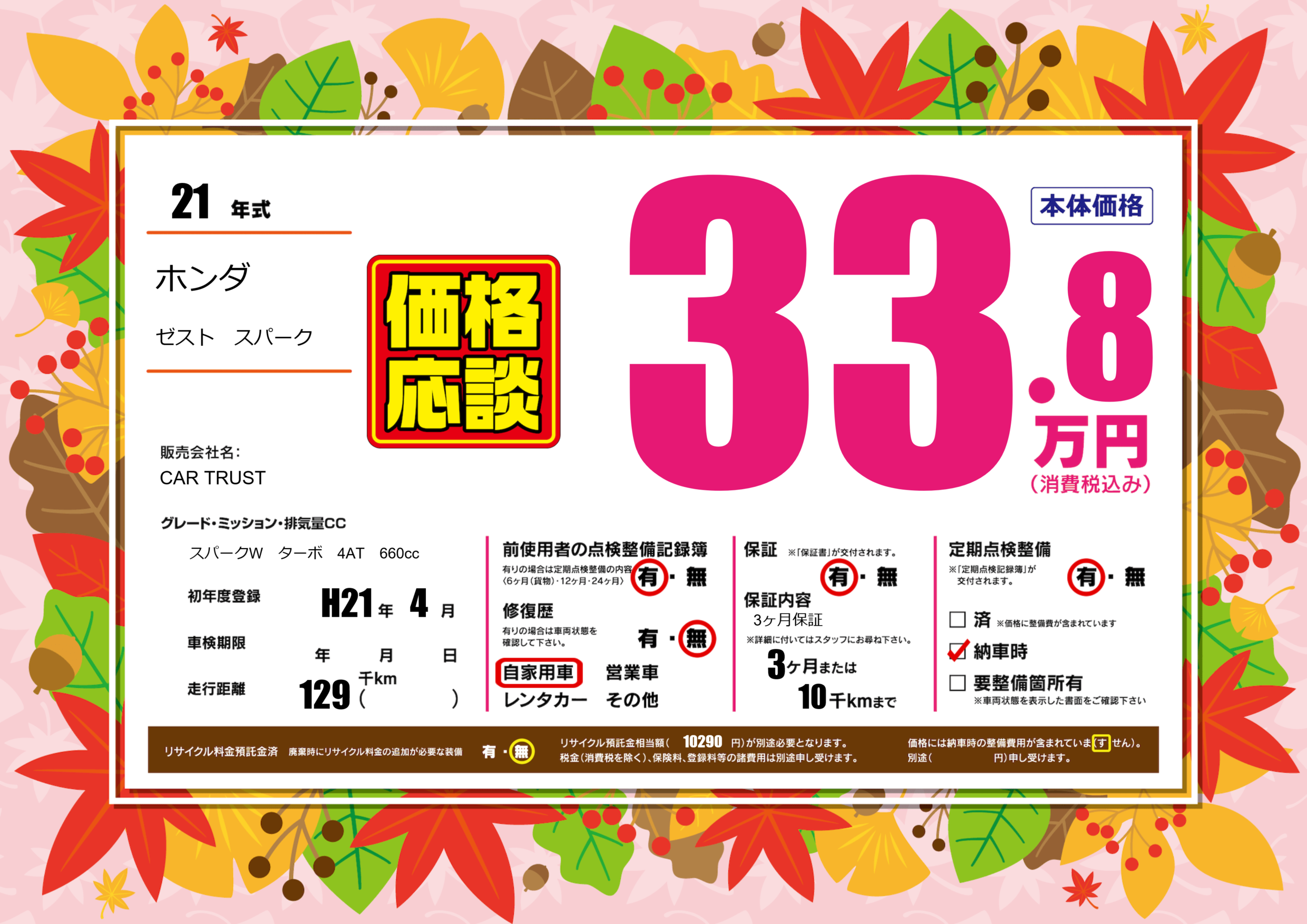 | 走行キロ | 12.9万km | 初年度登録 | H21年4月 |