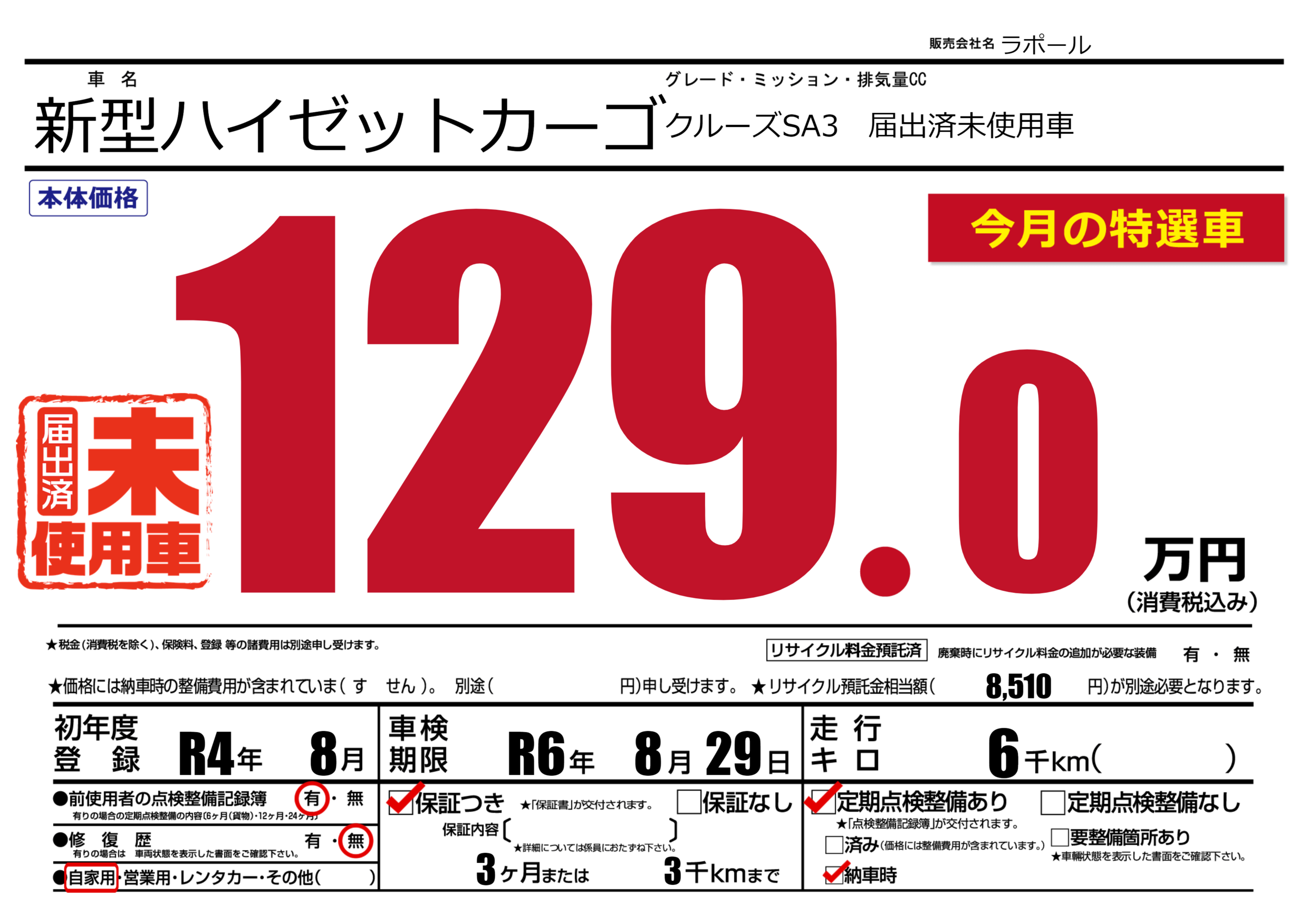 | 走行キロ | 0.6万km | 初年度登録 | R4年8月 |