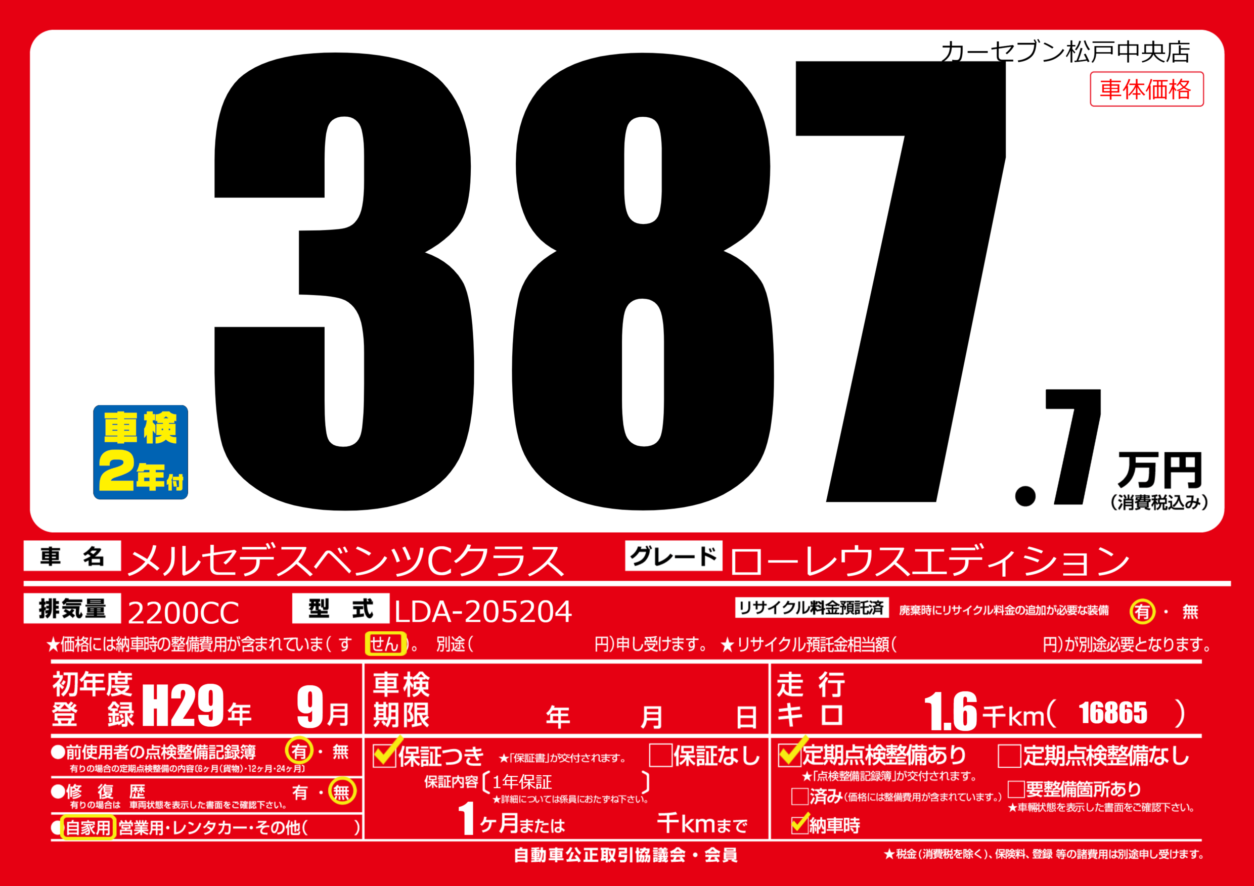 | 車名 | メルセデスベンツCクラス | グレード ミッション 排気量 |