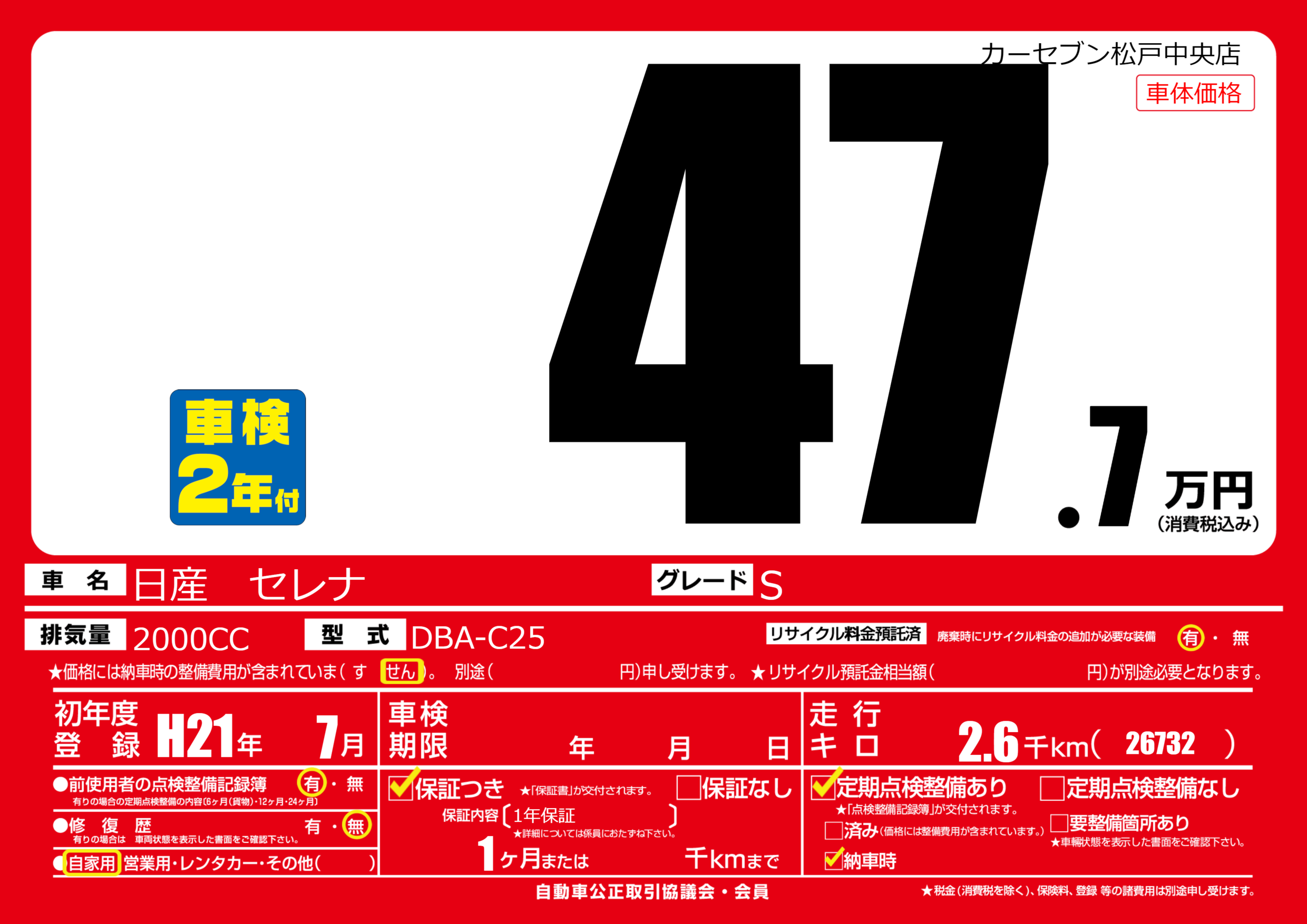 | 車名 | 日産 セレナ | グレード ミッション 排気量 |