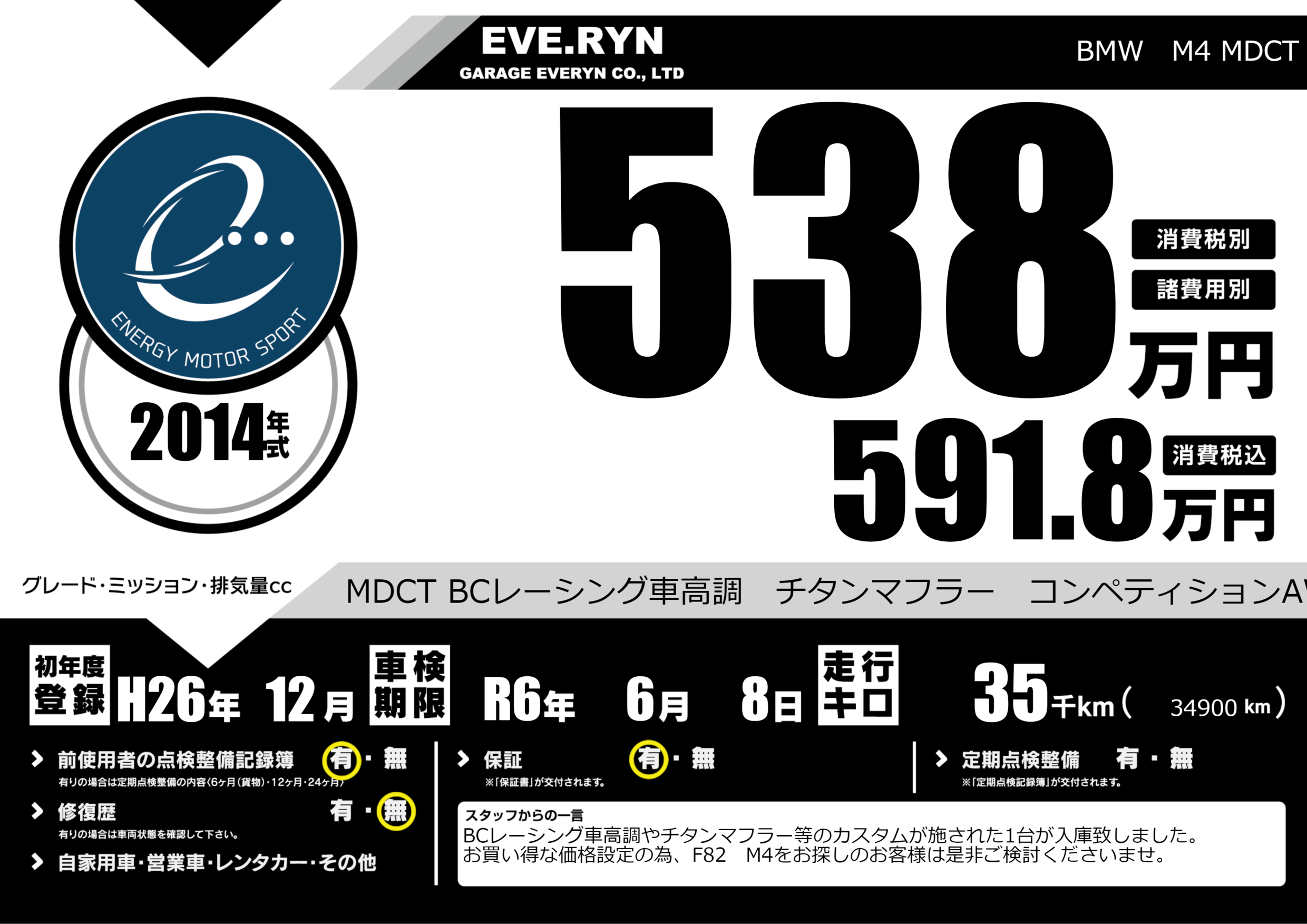 | 車名 | BMW M4 MDCT | グレード ミッション 排気量 |