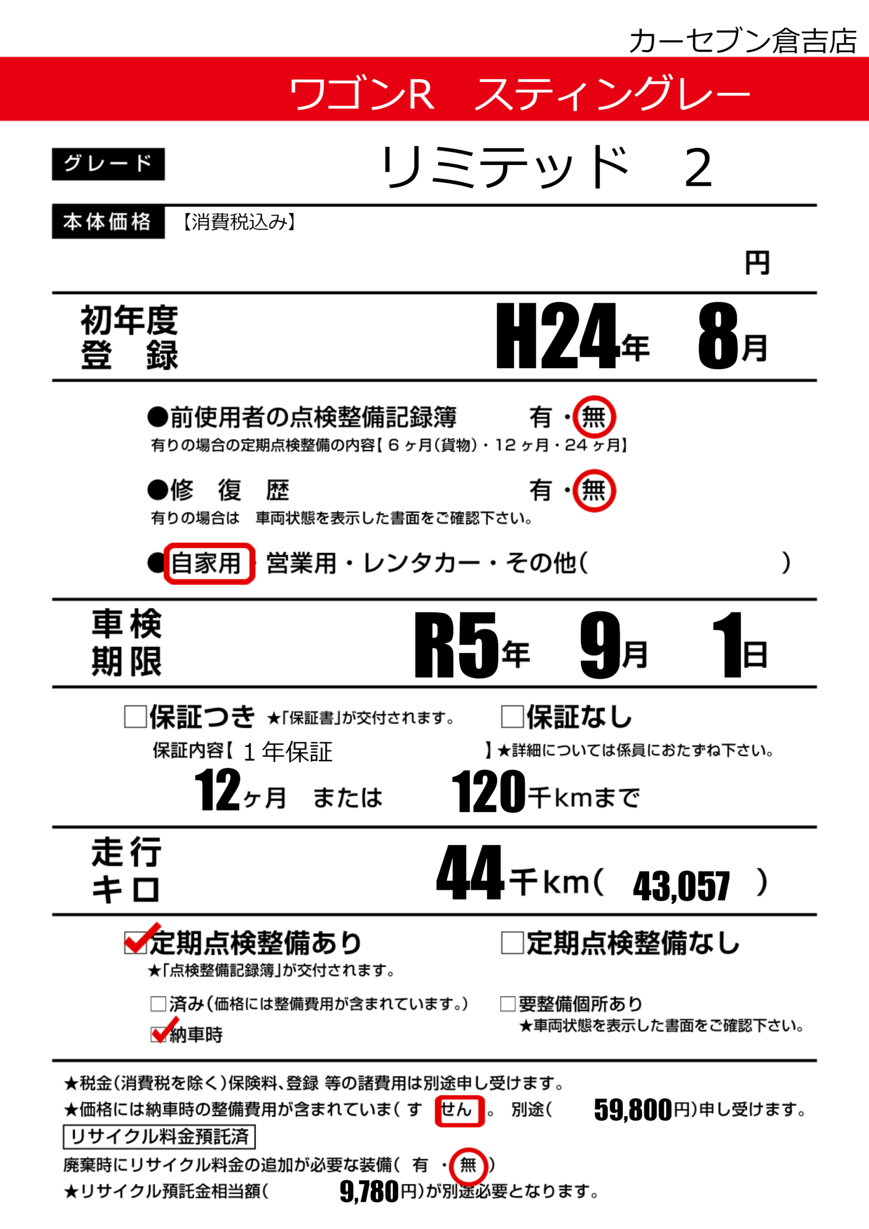 | 走行キロ | 4.4万km | 初年度登録 | H24年8月 |