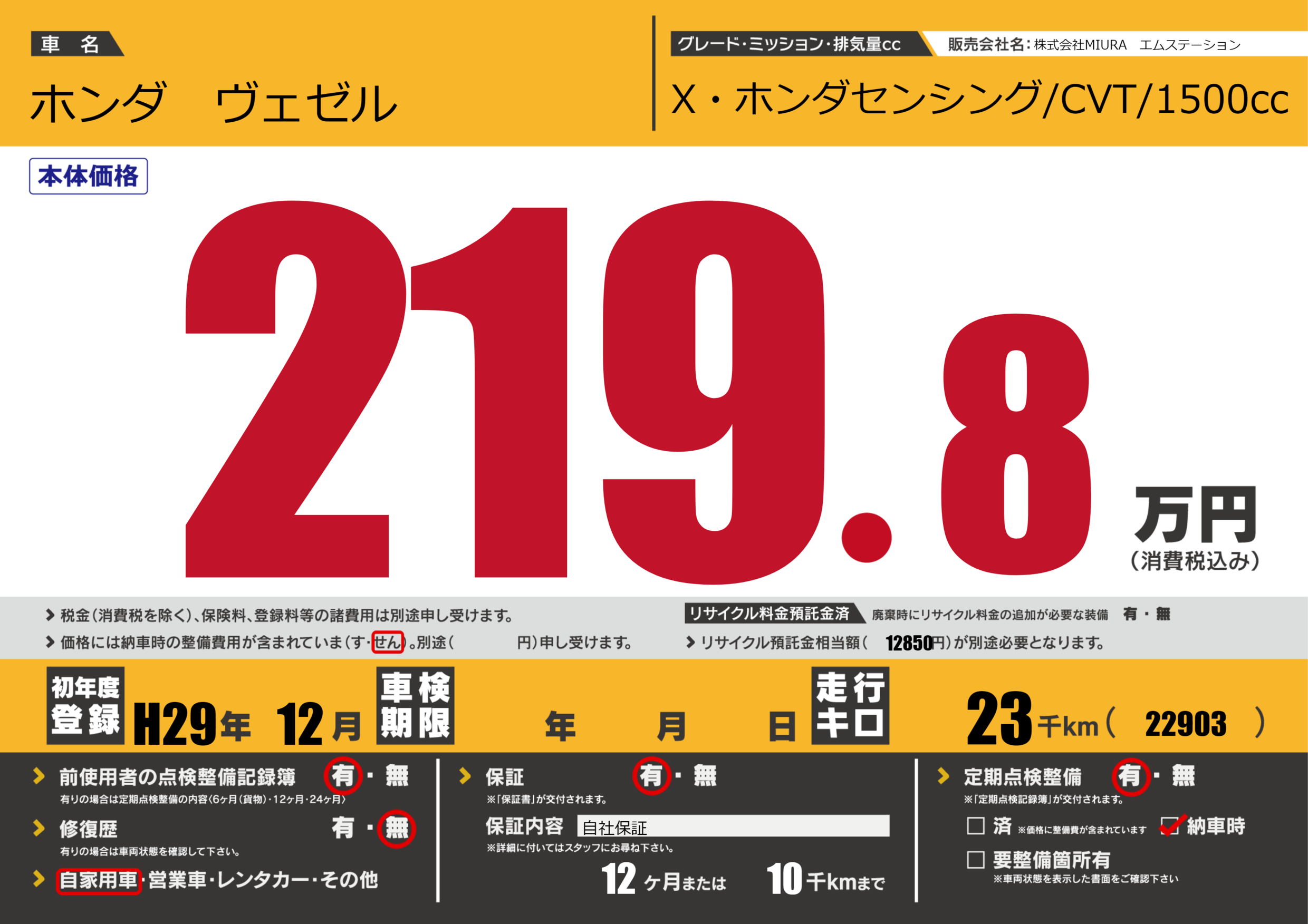 | 車名 | ホンダ ヴェゼル | グレード ミッション 排気量 |