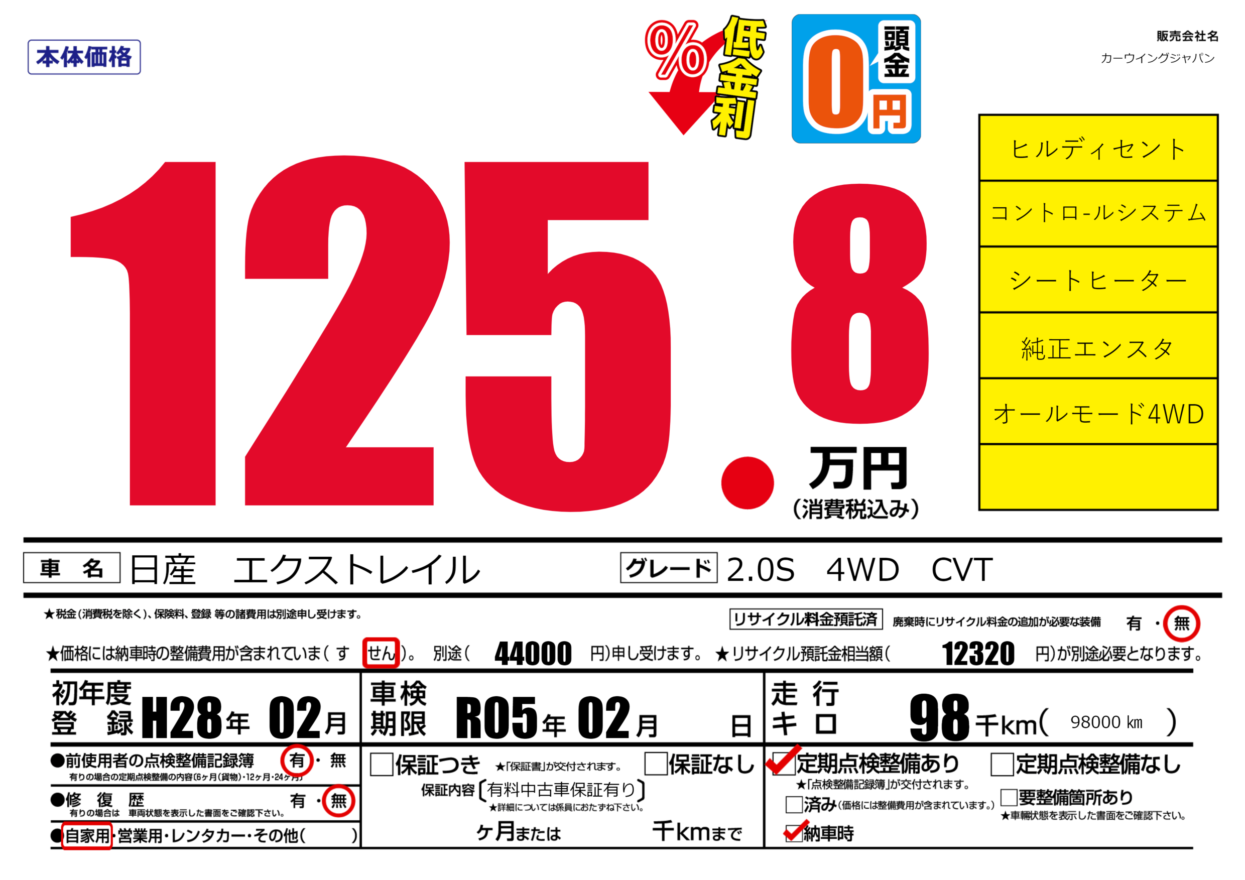 | 車名 | 日産 エクストレイル | グレード ミッション 排気量 |