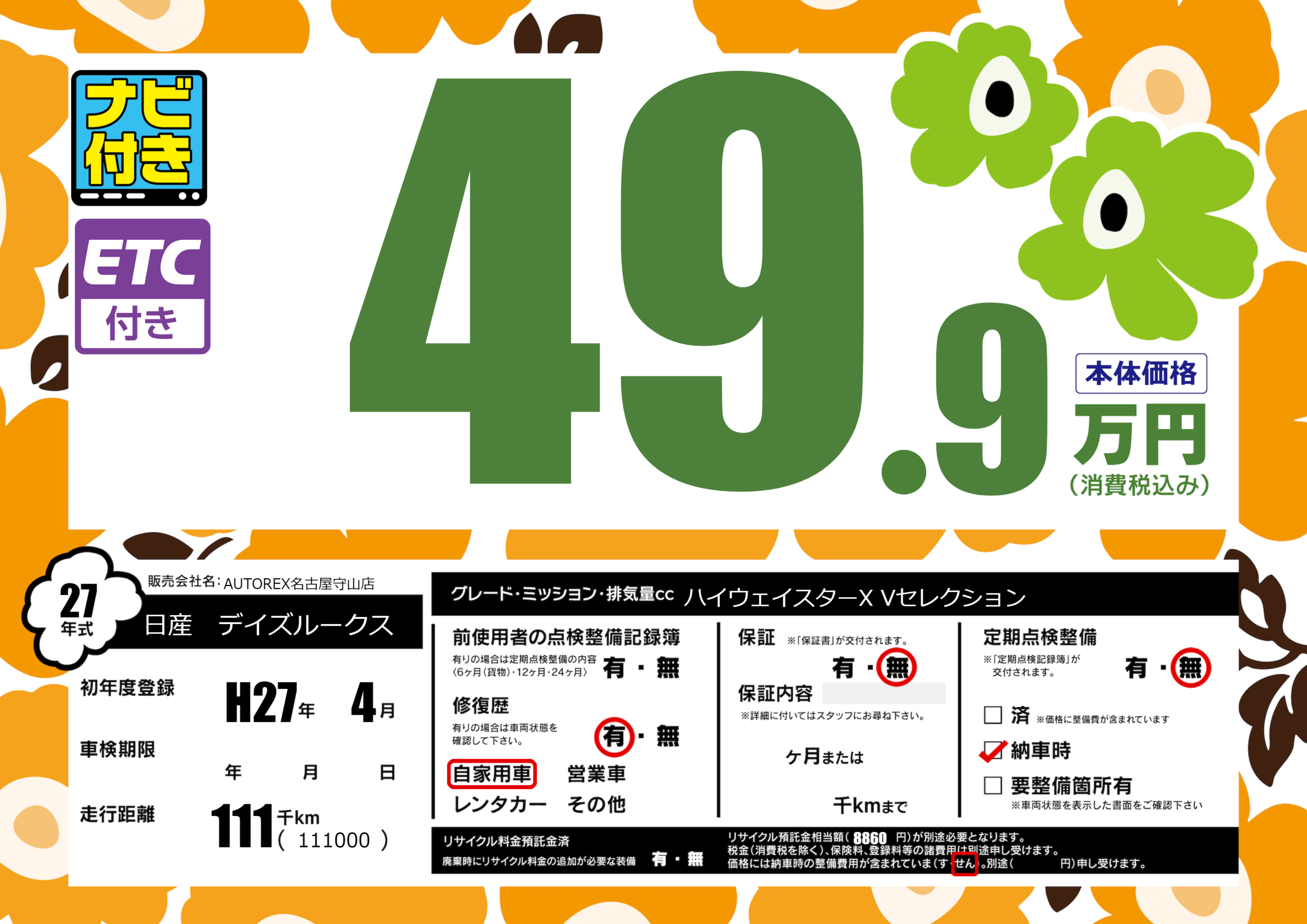 | 車名 | 日産 デイズルークス | グレード ミッション 排気量 |