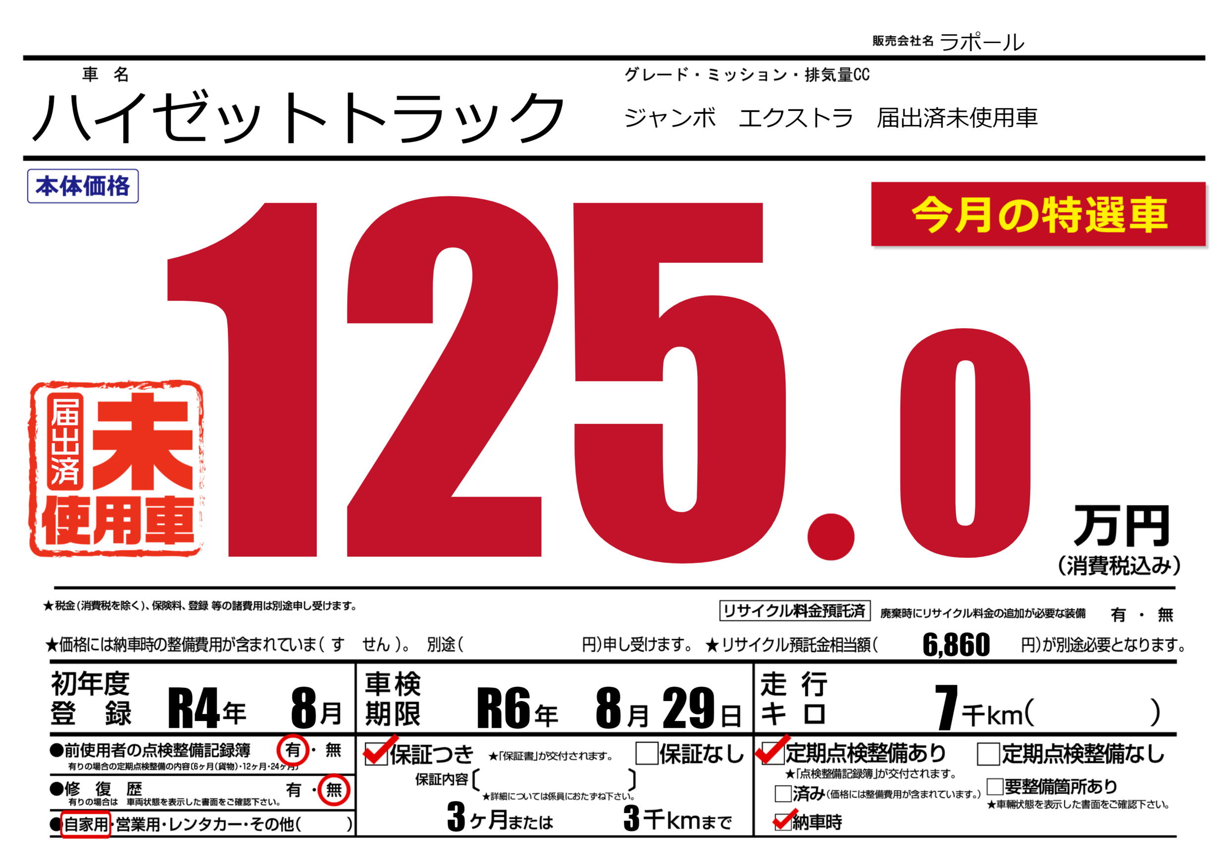 | 走行キロ | 0.7万km | 初年度登録 | R4年8月 |