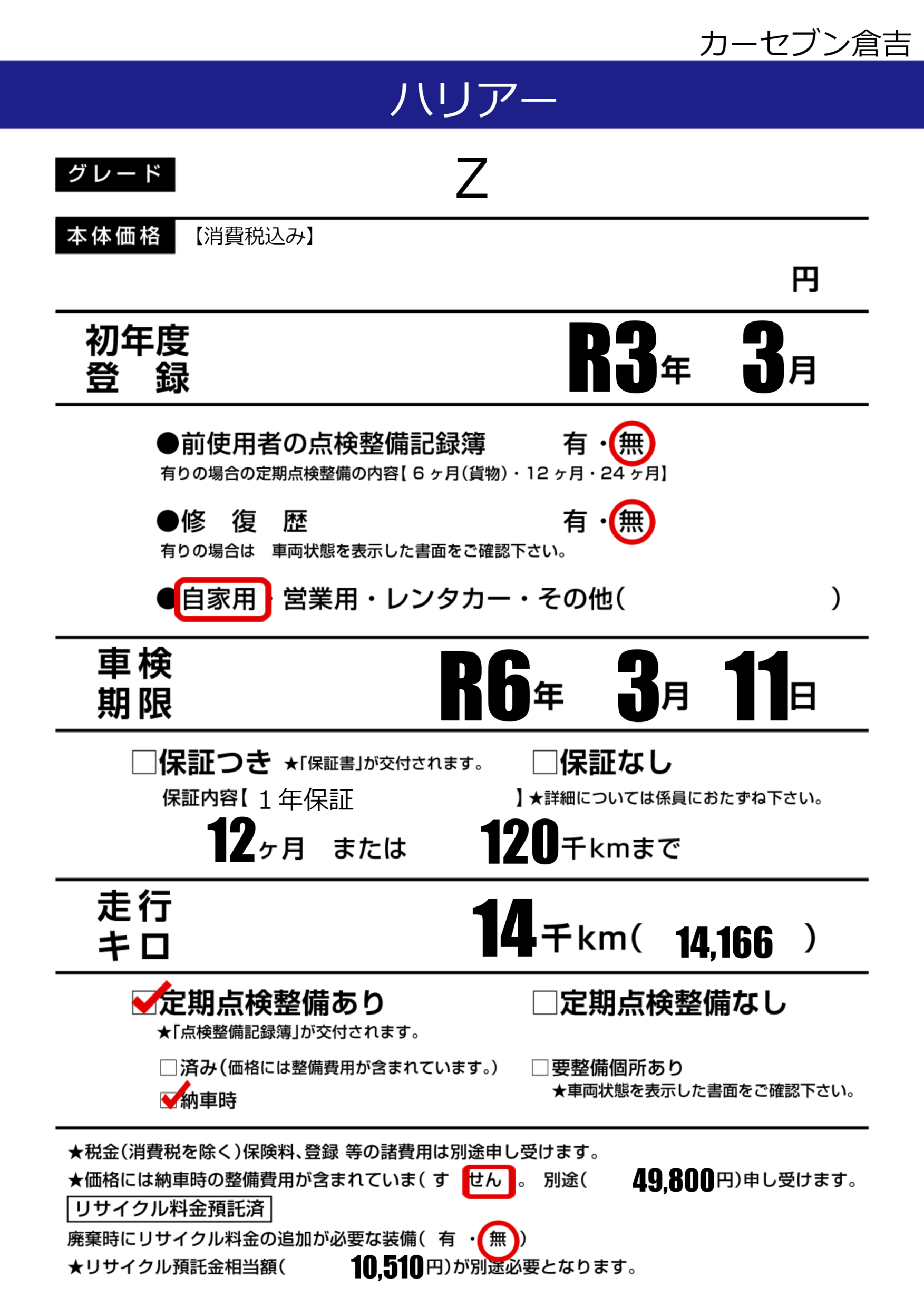 | 定期点検整備 | 定期点検整備あり 納車時あり | ||