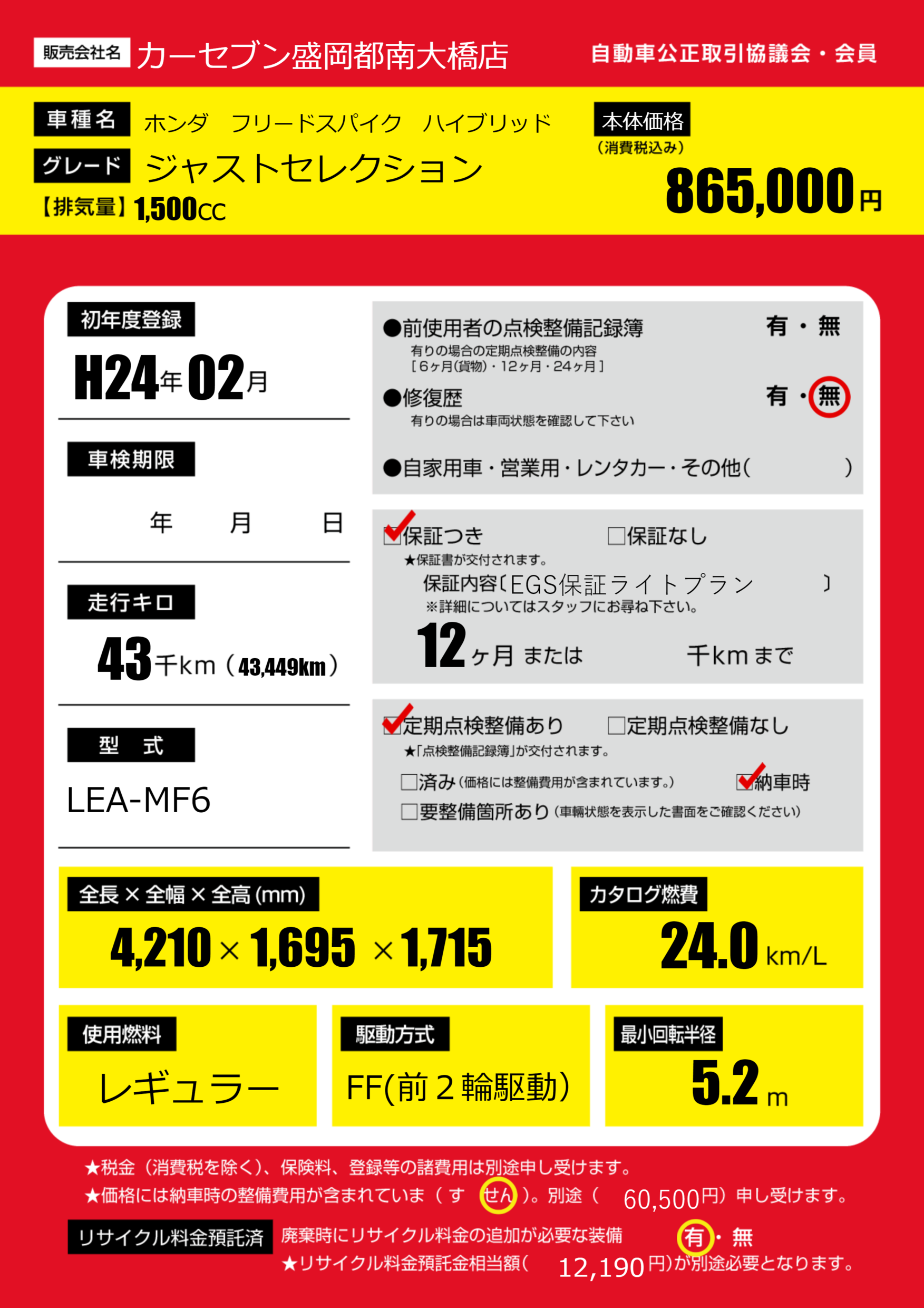 | 車名 | ホンダ フリードスパイク ハイブリッド | グレード ミッション 排気量 |