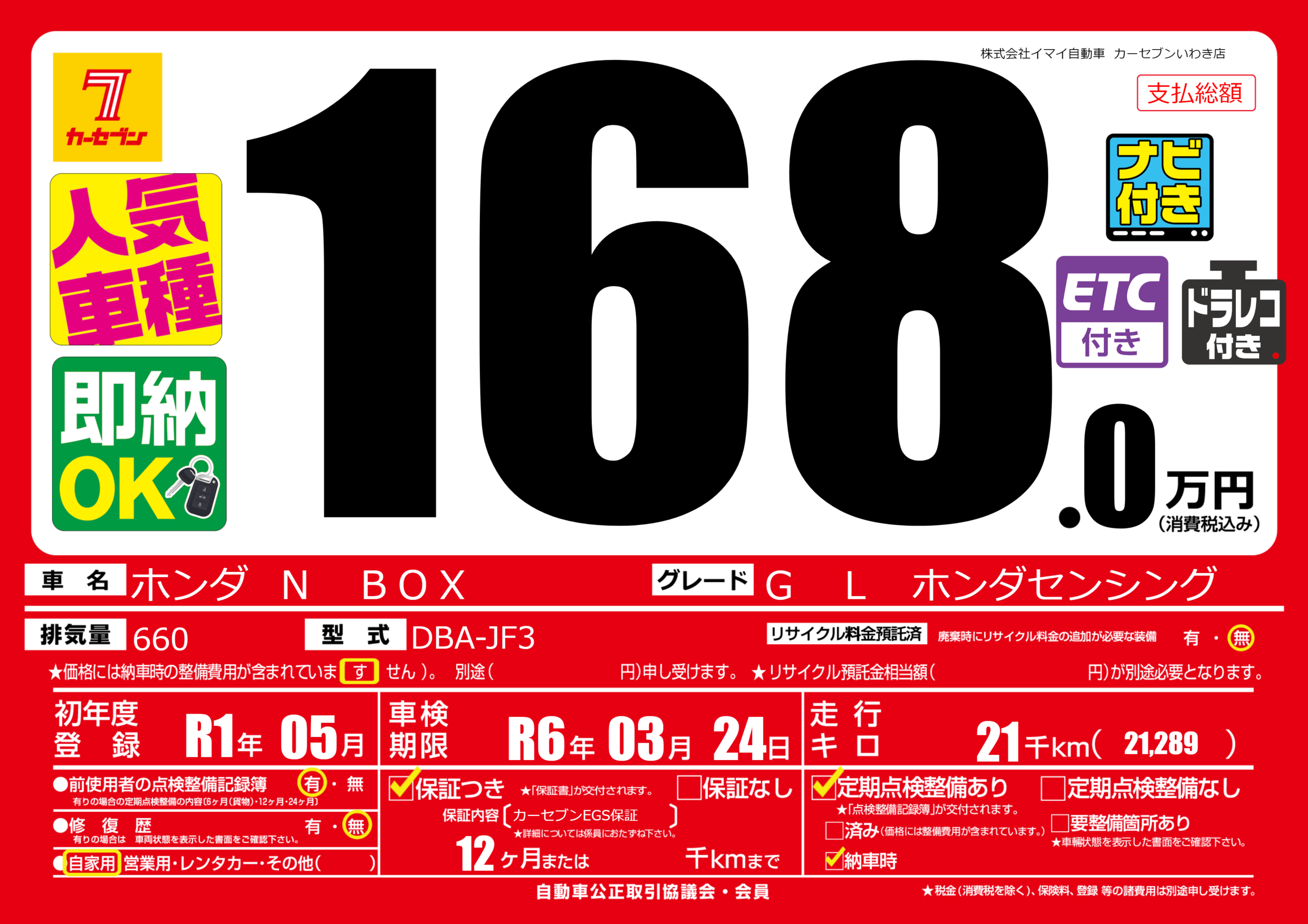 | 車名 | ホンダ N BOX | グレード ミッション 排気量 |