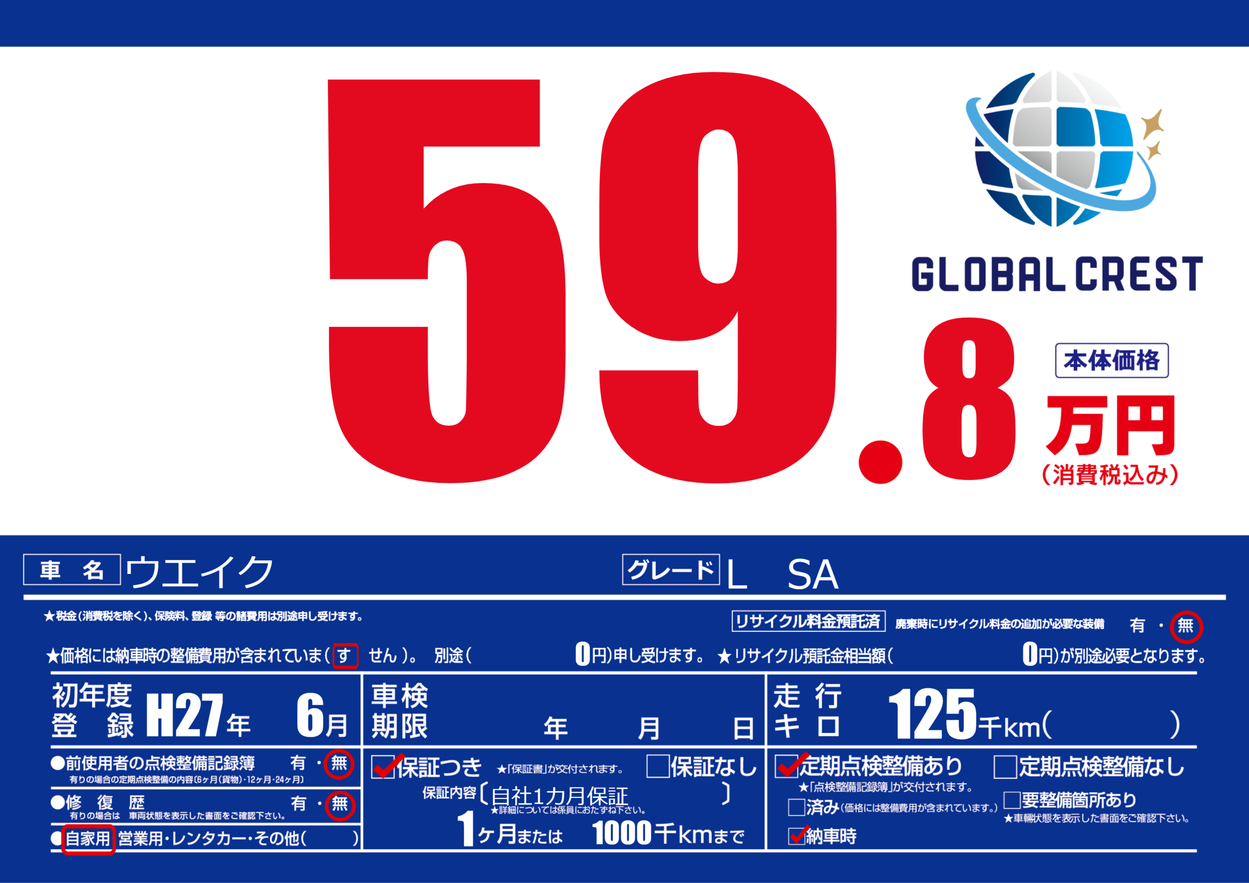 | 走行キロ | 12.5万km | 初年度登録 | H27年6月 |