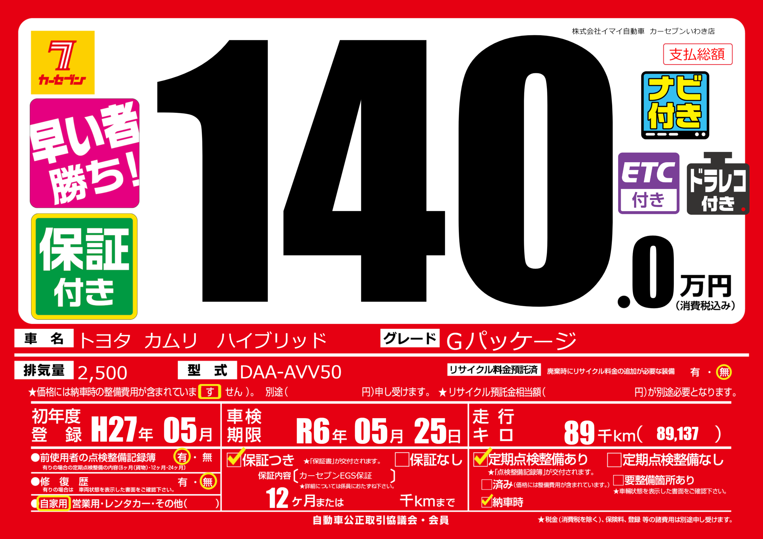 保証付き 保証内容(カーセブンEGS保証) 12ヶ月または()千kmまで |