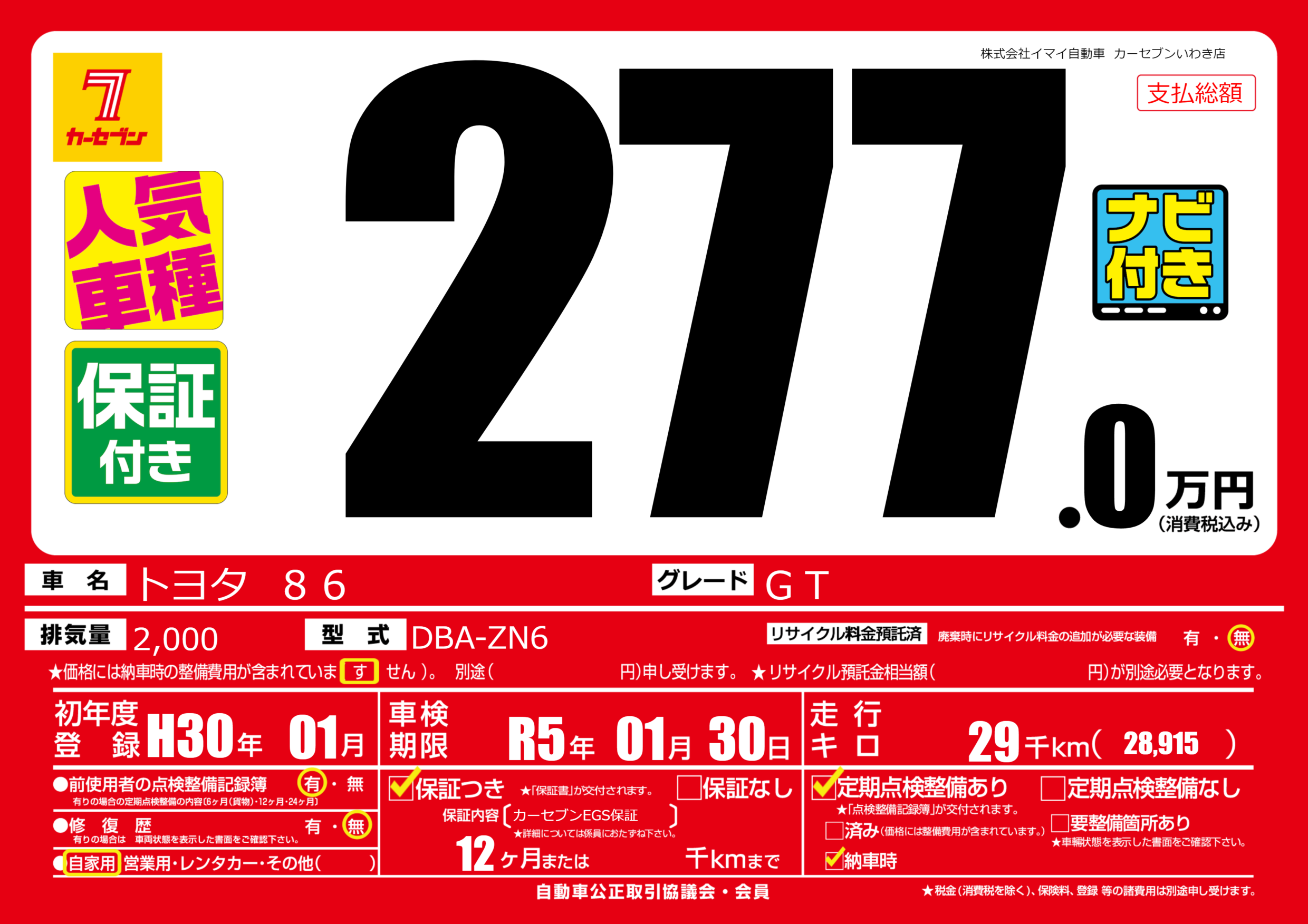 | 車名 | トヨタ 86 | グレード ミッション 排気量 |