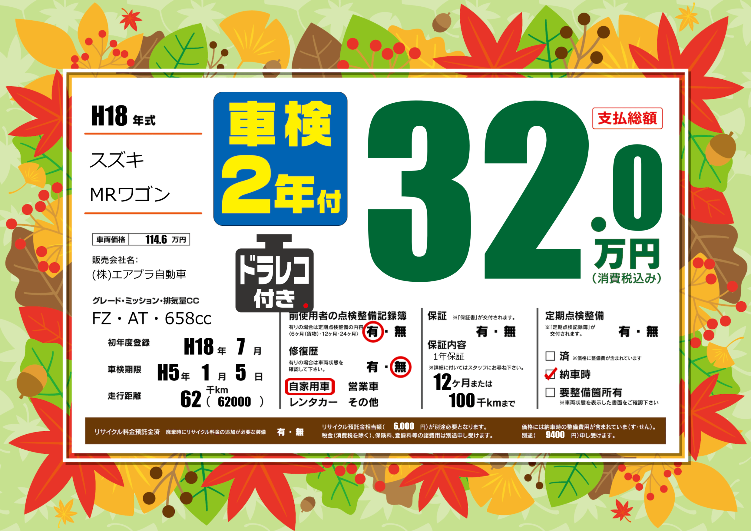| 走行キロ | 6.2万km | 初年度登録 | H18年7月 |