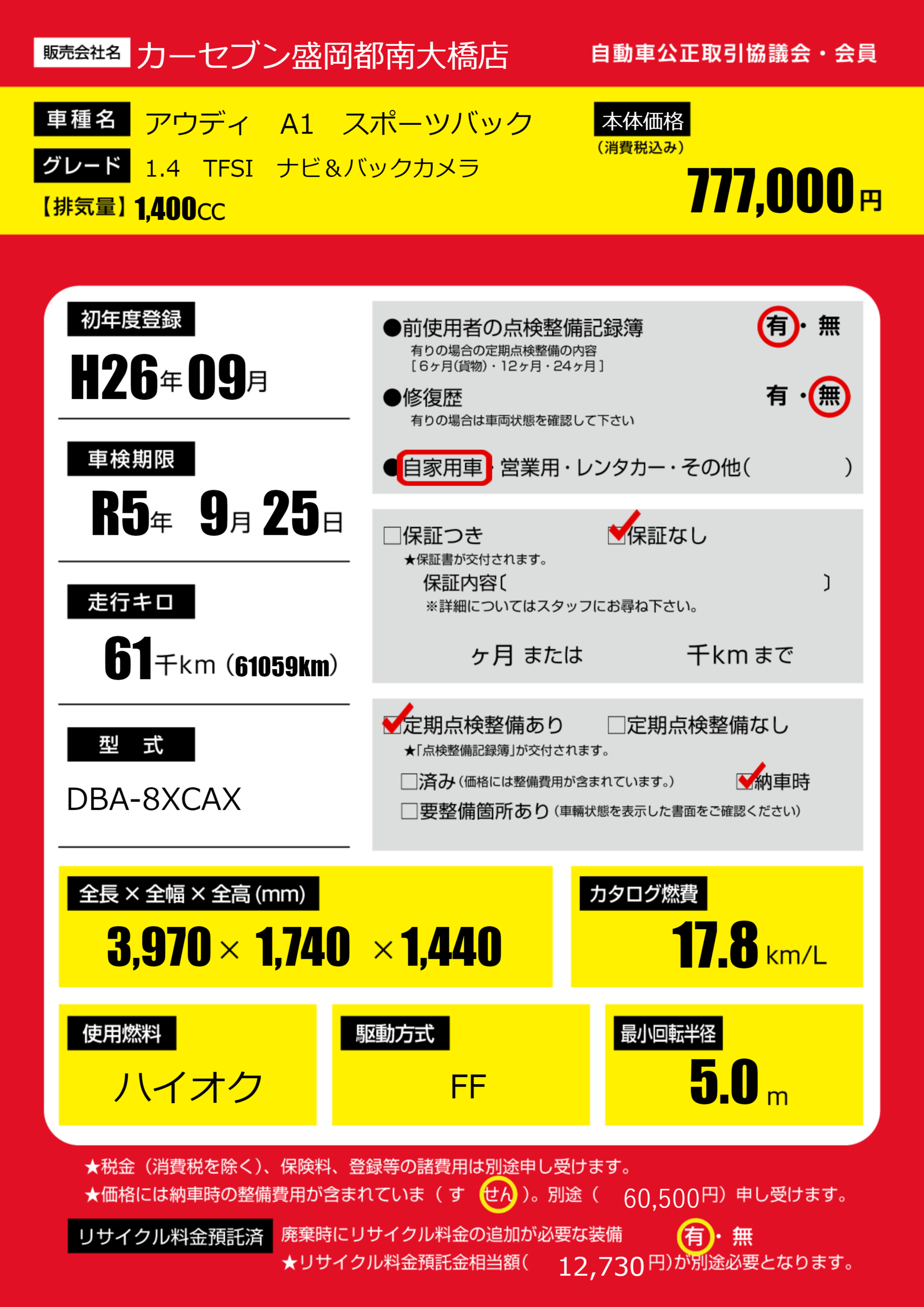 | 車名 | アウディ A1 スポーツバック | グレード ミッション 排気量 |