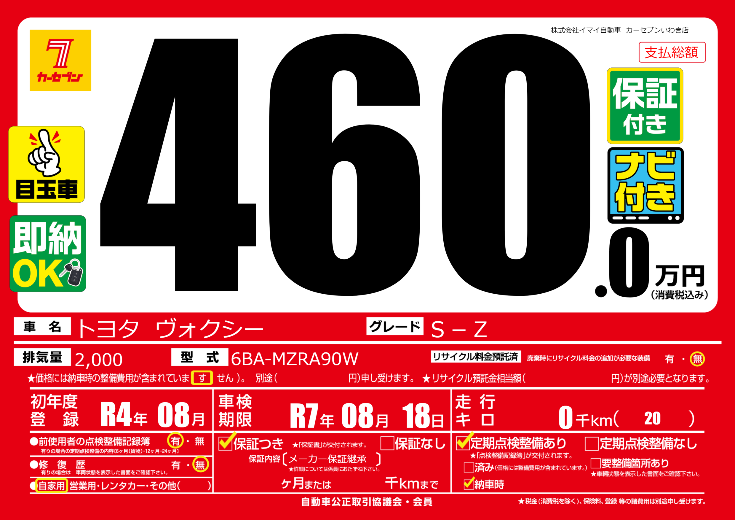 | 車名 | トヨタ ヴォクシー | グレード ミッション 排気量 |