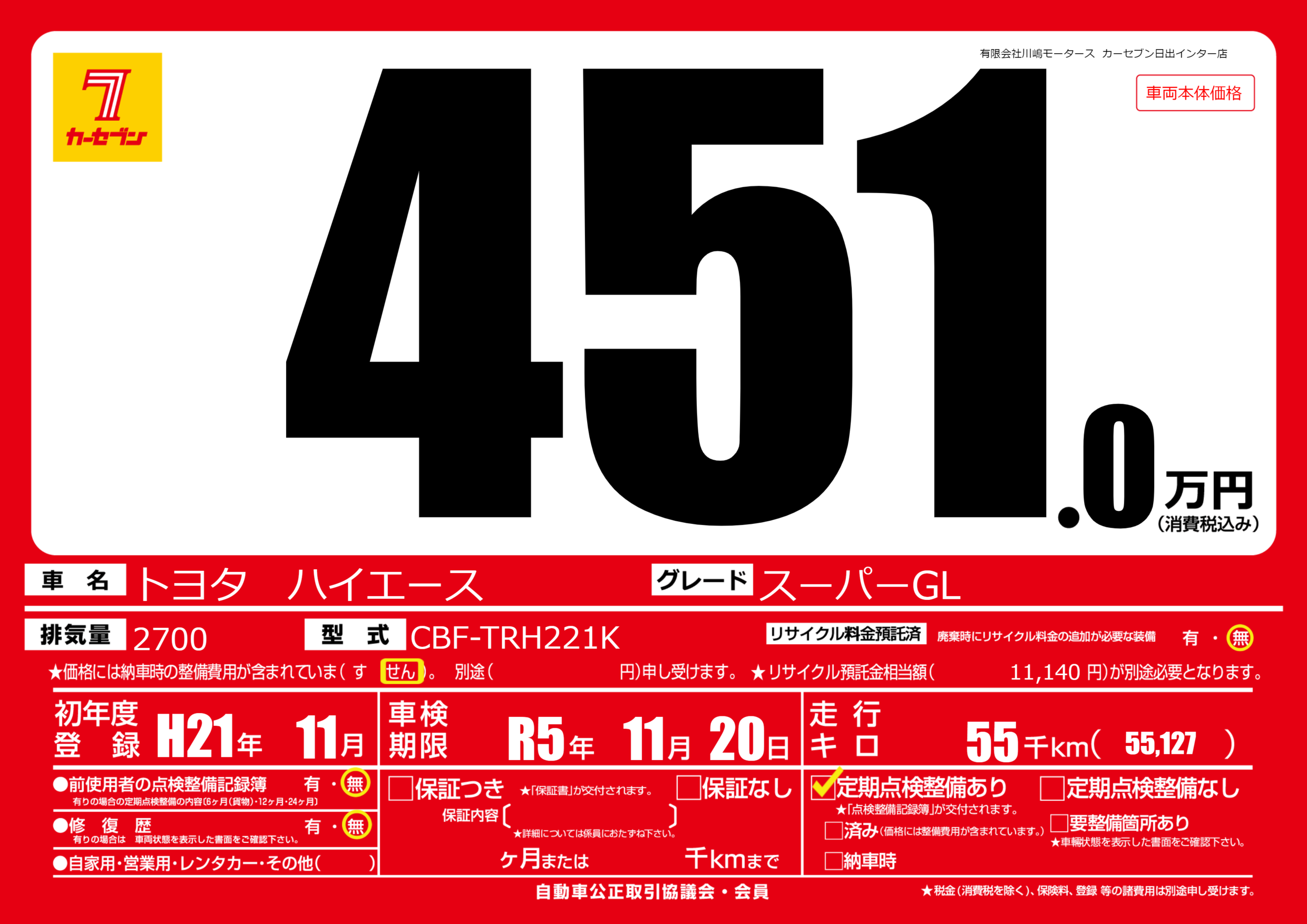 | 車名 | トヨタ ハイエース | グレード ミッション 排気量 |