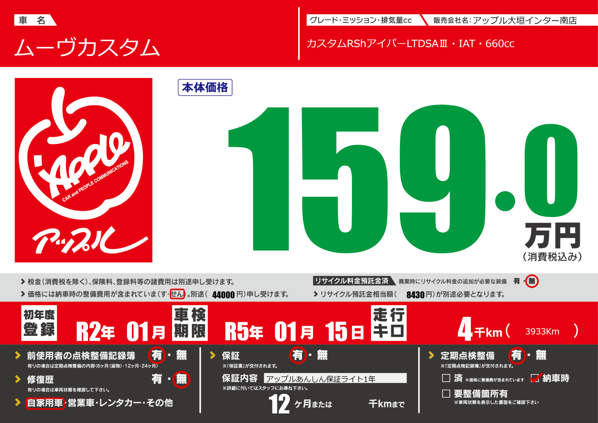 | 走行キロ | 0.4万km | 初年度登録 | R2年01月 |