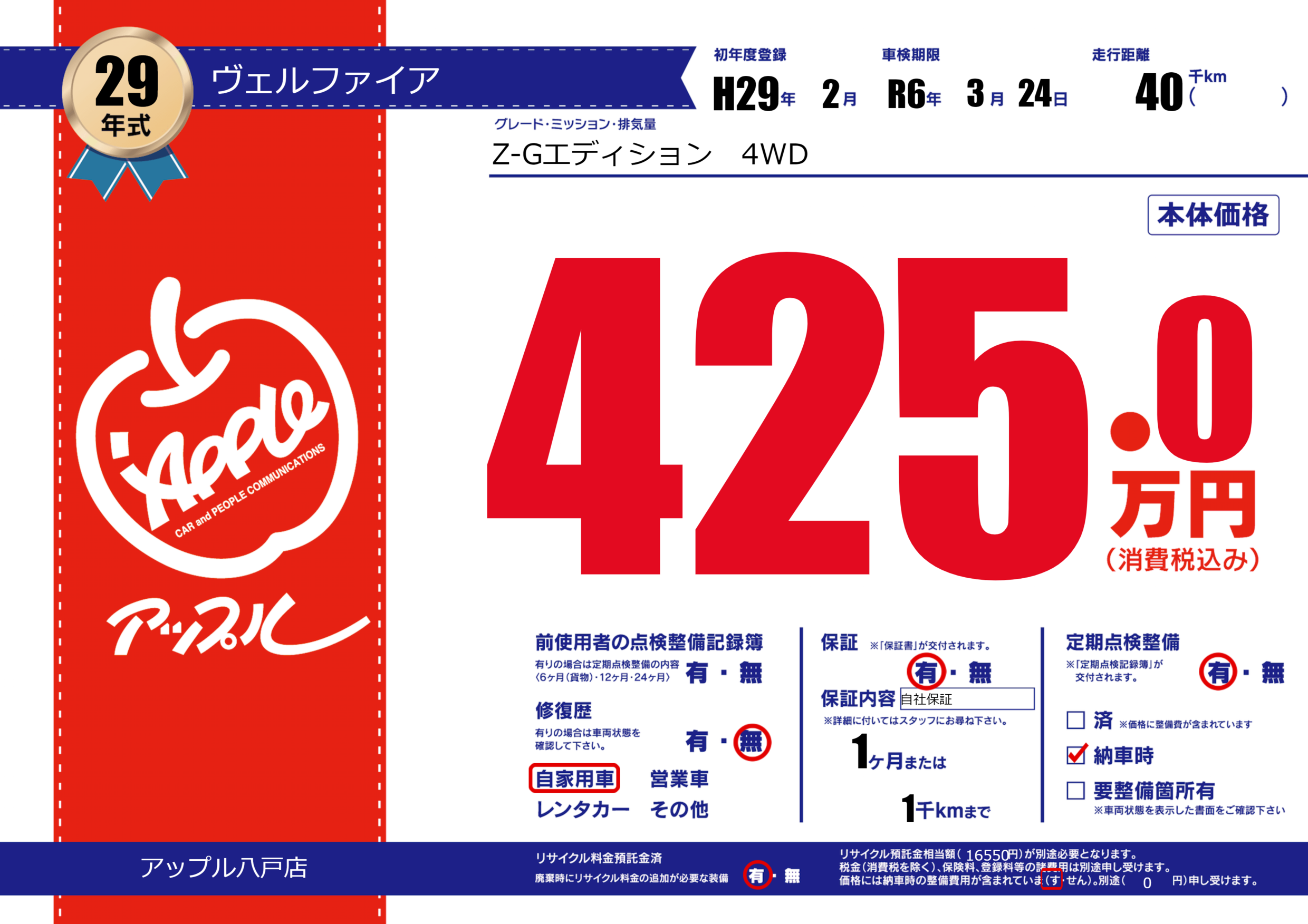 | 走行キロ | 4万km | 初年度登録 | H29年2月 |