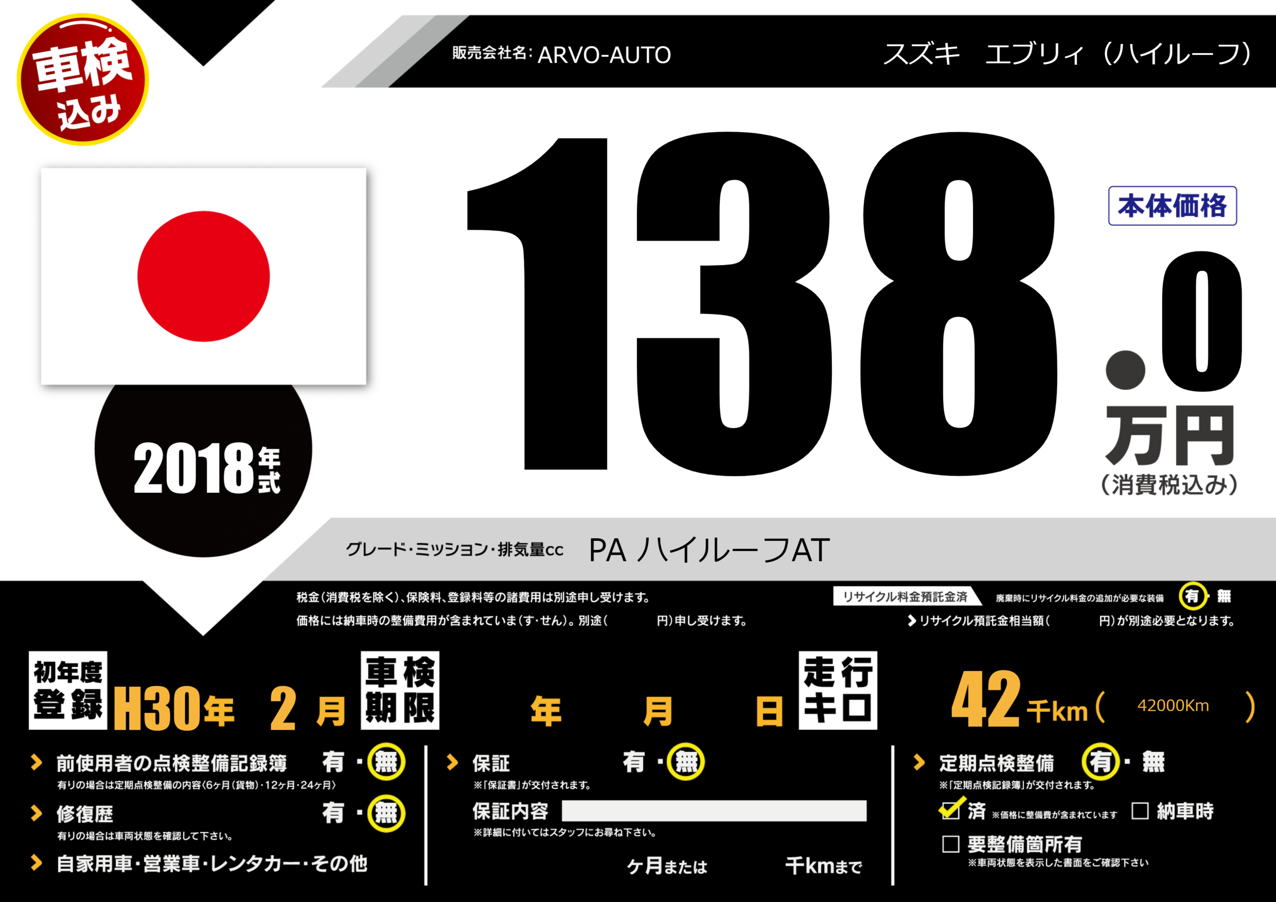 | 車名 | スズキ エブリィ(ハイルーフ) | グレード ミッション 排気量 |