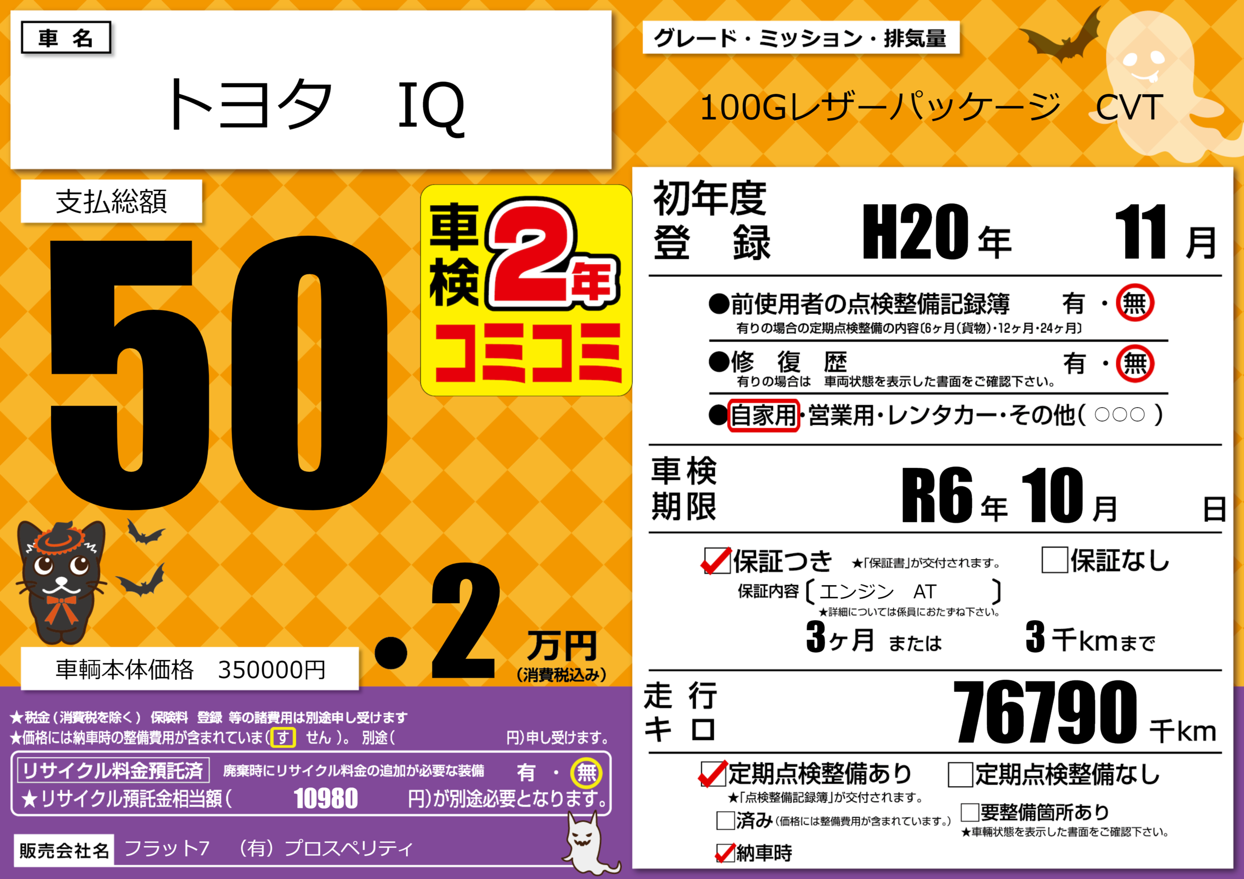 | 車名 | トヨタ IQ | グレード ミッション 排気量 |