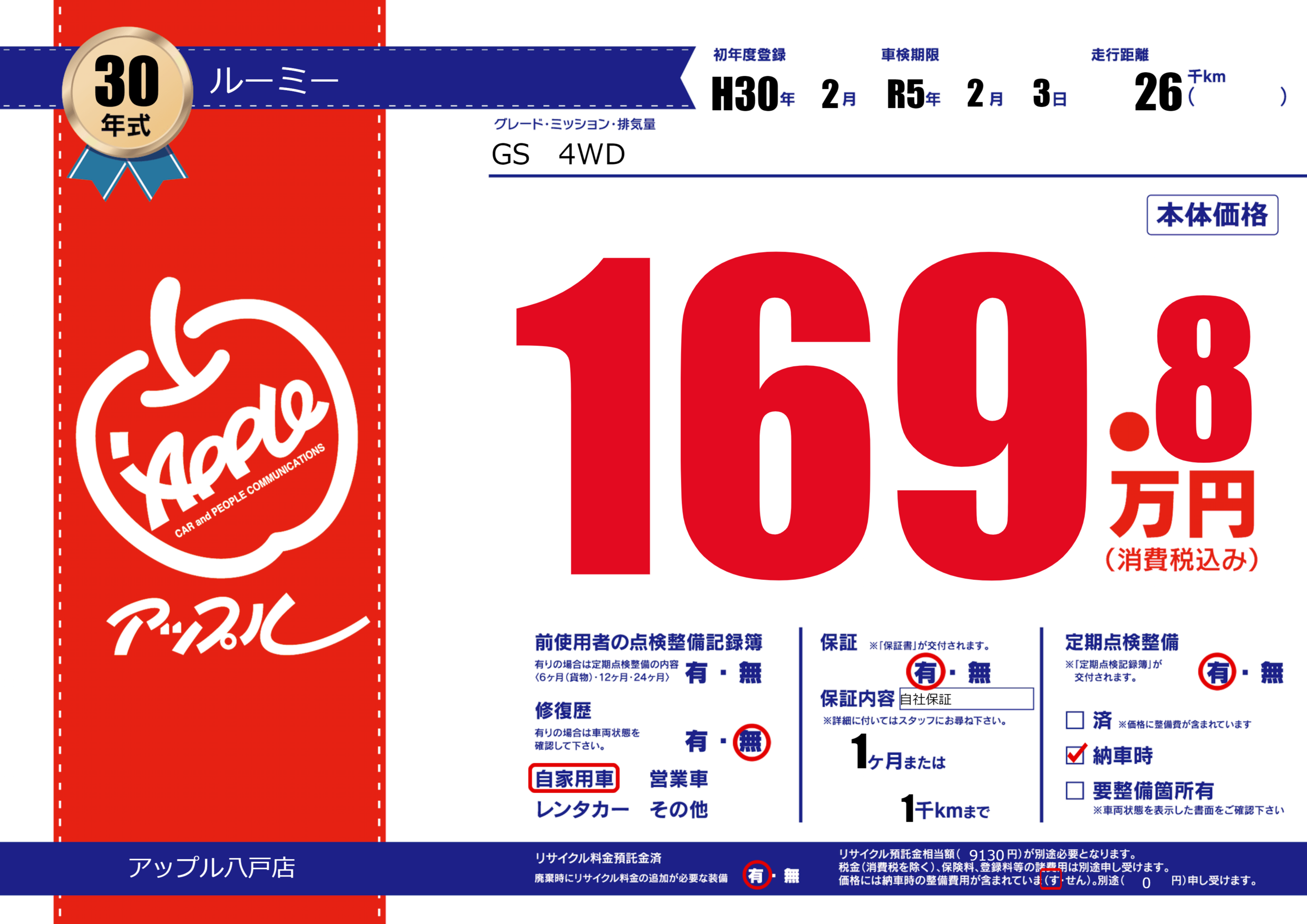 | 走行キロ | 2.6万km | 初年度登録 | H30年2月 |