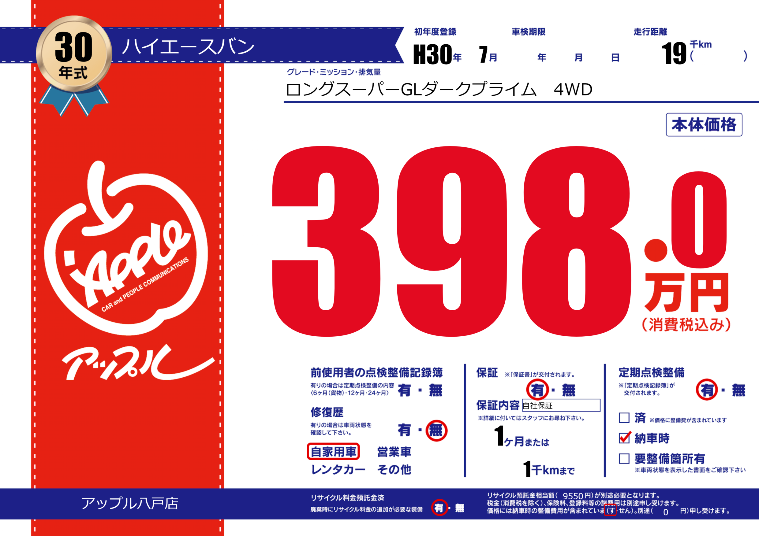 保証付き 保証内容(自社保証) 1ヶ月または(1)千kmまで |