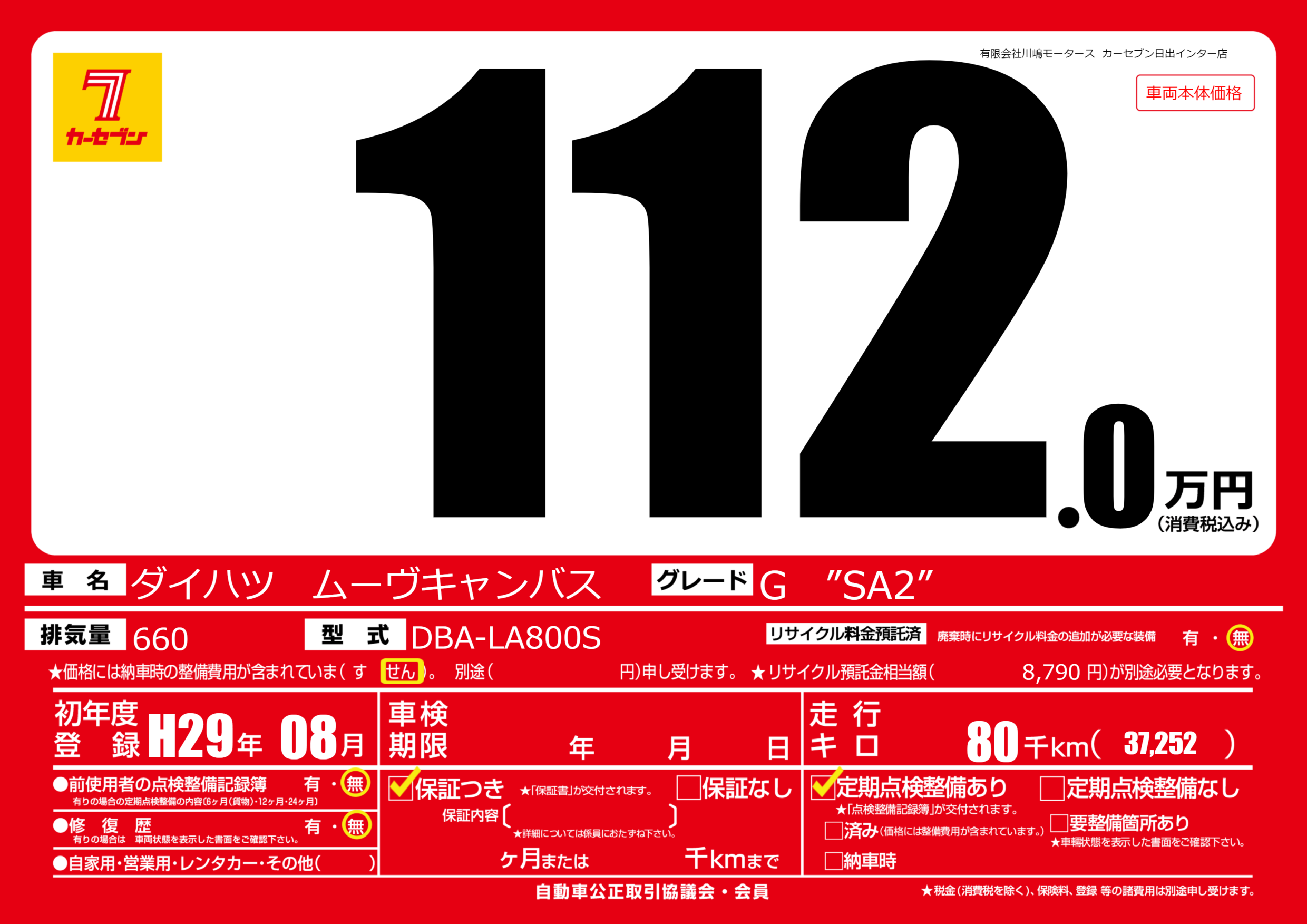 | 走行キロ | 8万km | 初年度登録 | H29年08月 |