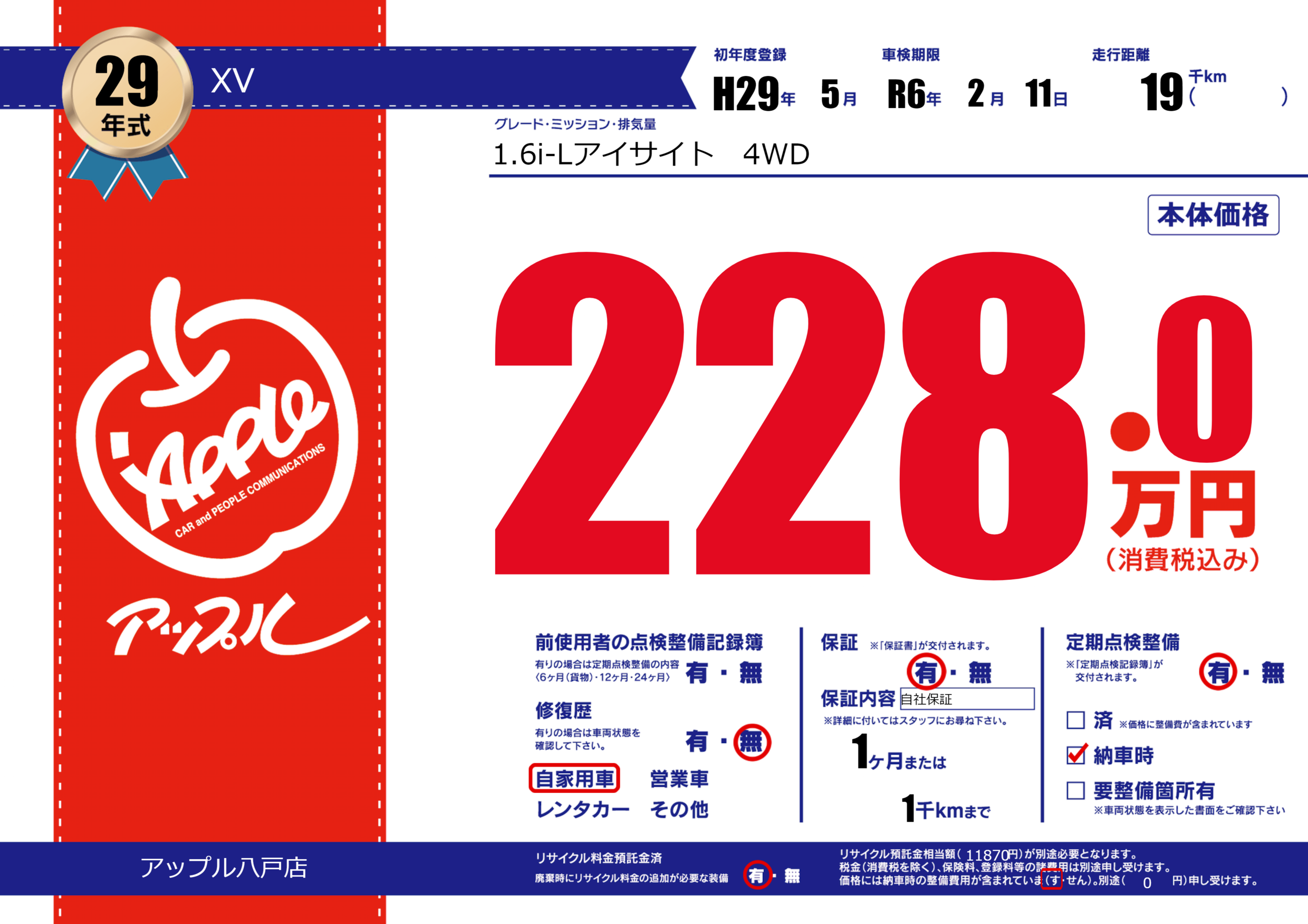 保証付き 保証内容(自社保証) 1ヶ月または(1)千kmまで |