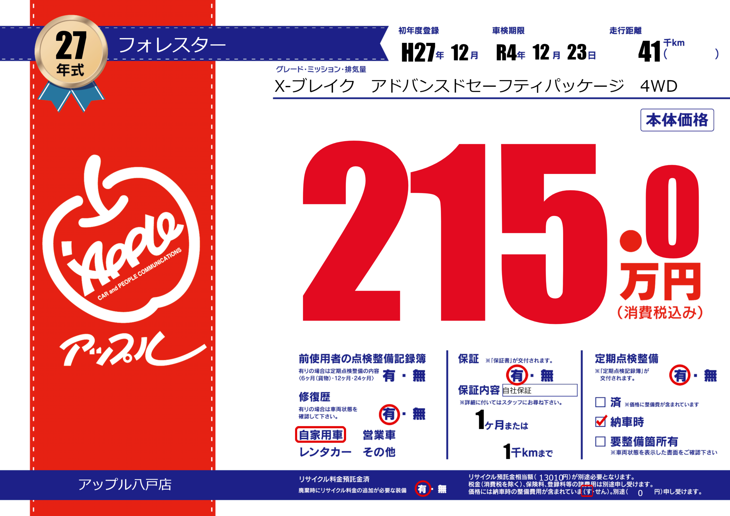 | 車名 | フォレスター | グレード ミッション 排気量 |