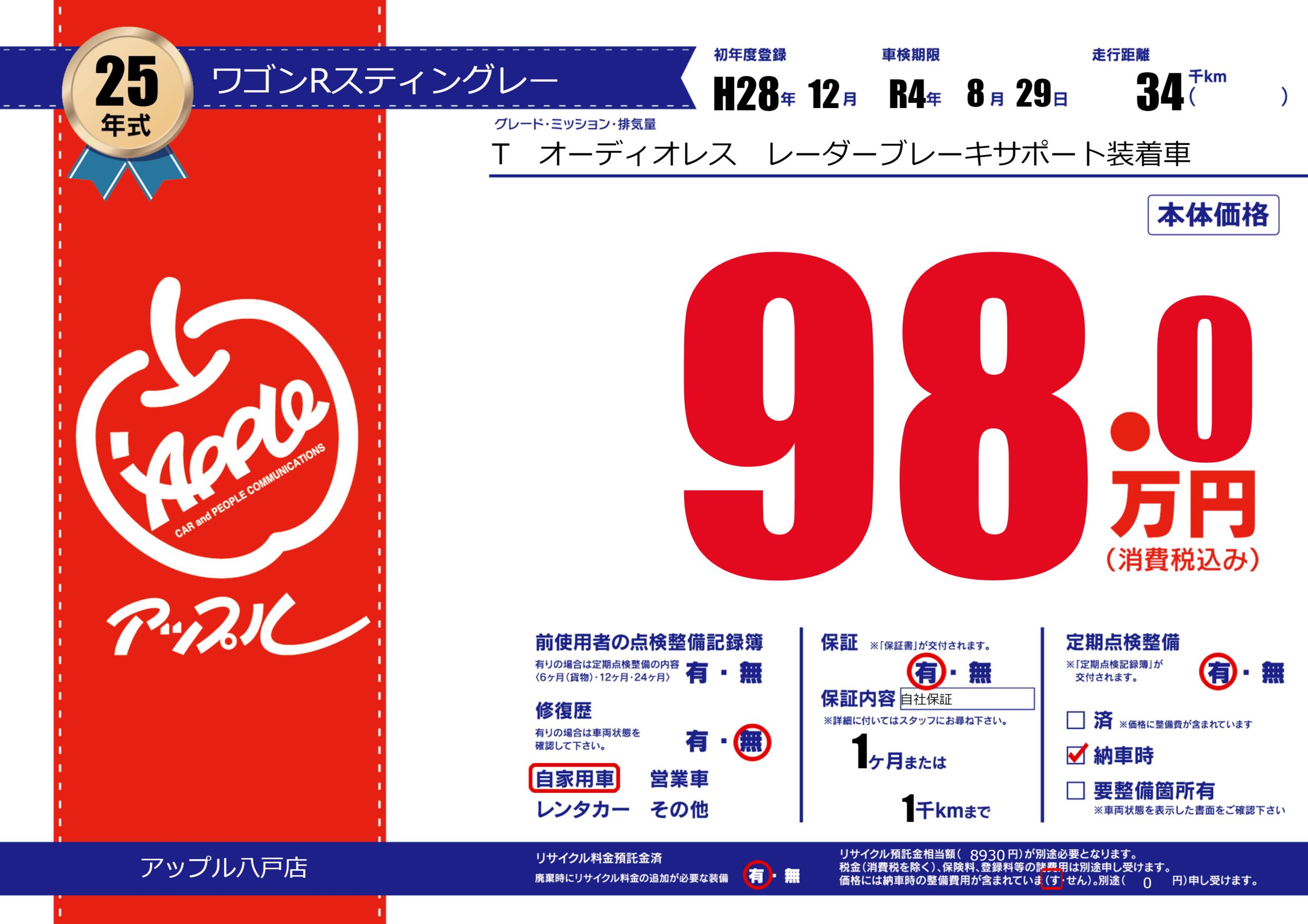| 走行キロ | 3.4万km | 初年度登録 | H28年12月 |