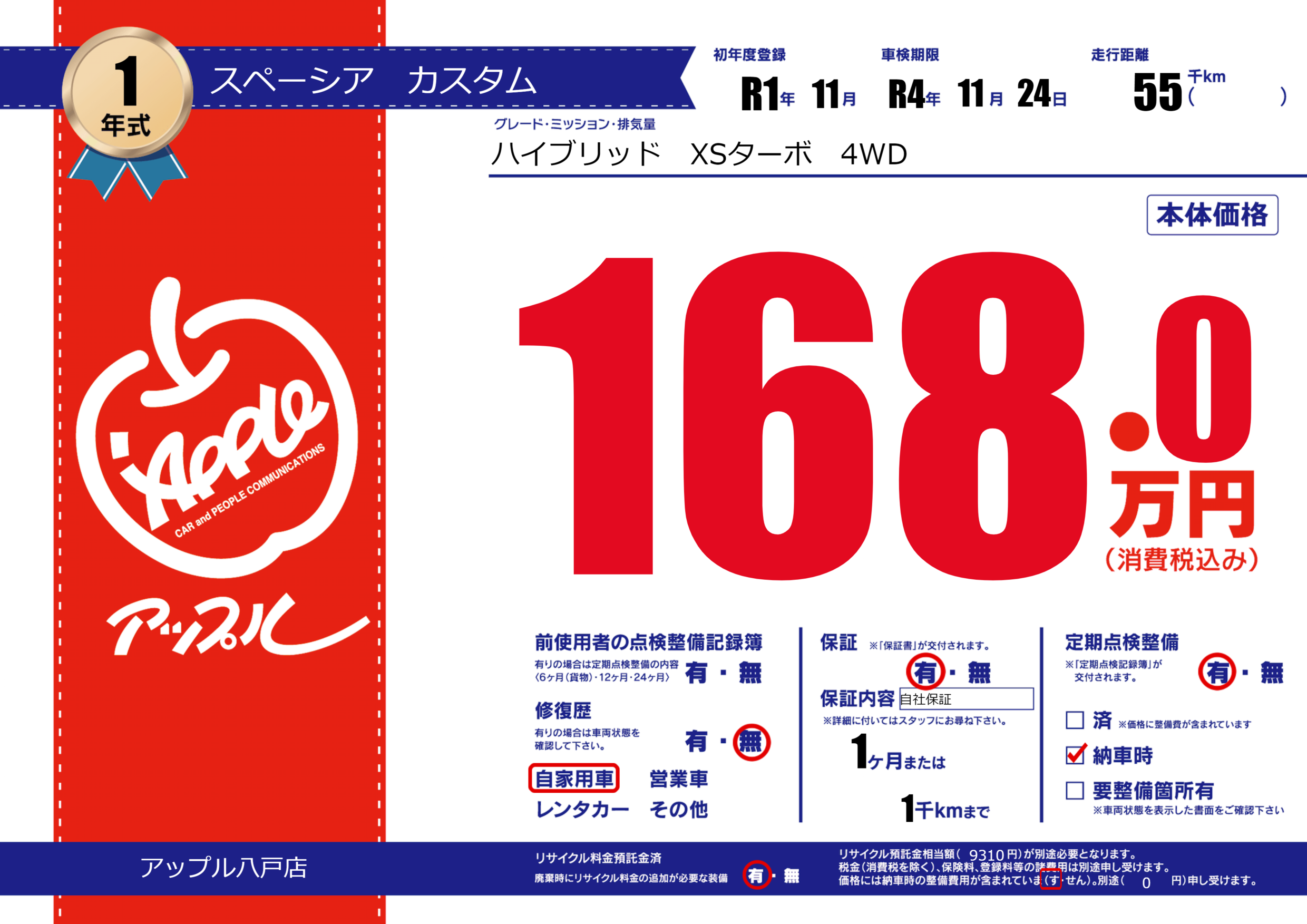 保証付き 保証内容(自社保証) 1ヶ月または(1)千kmまで |