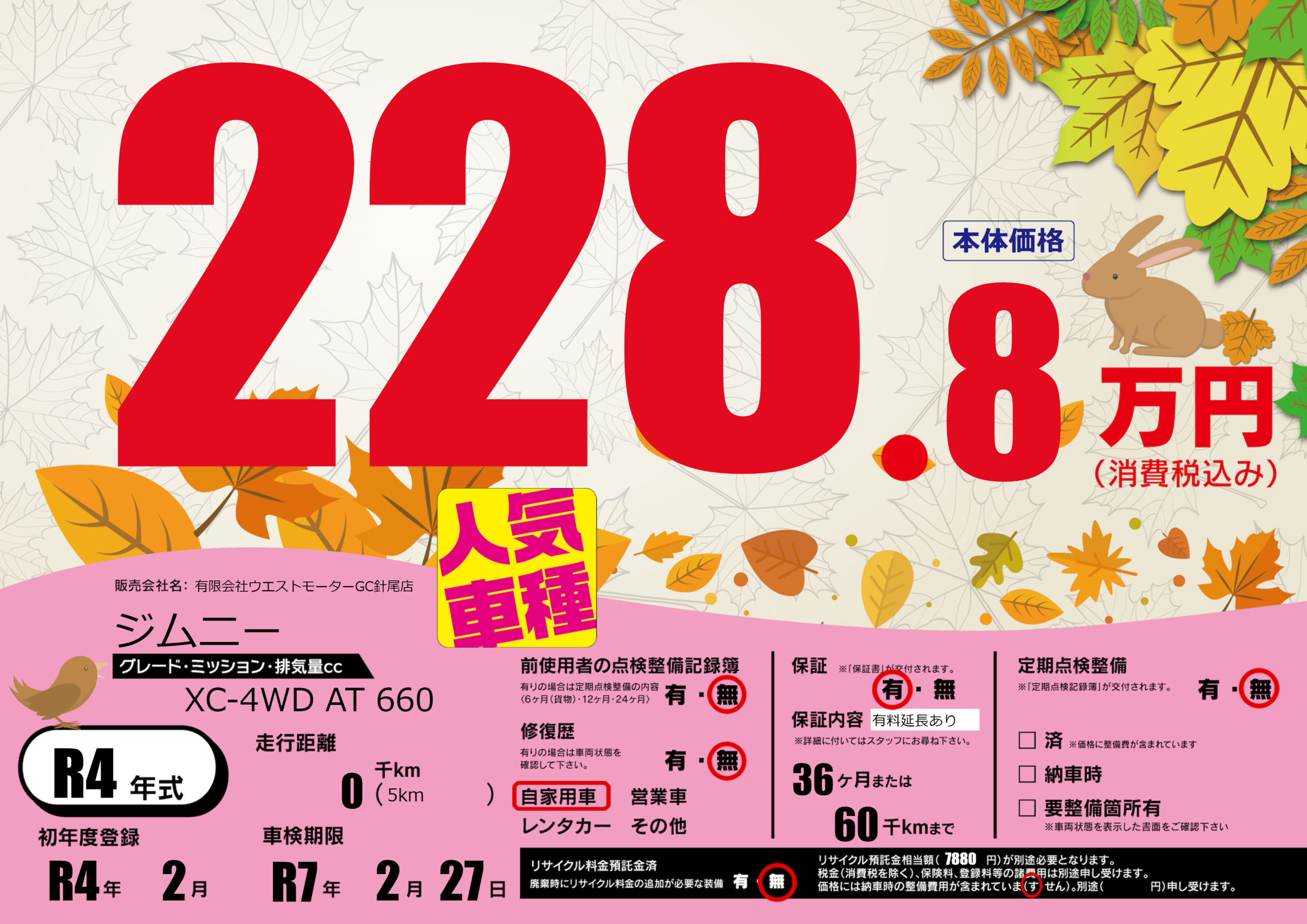 | 車名 | ジムニー | グレード ミッション 排気量 |