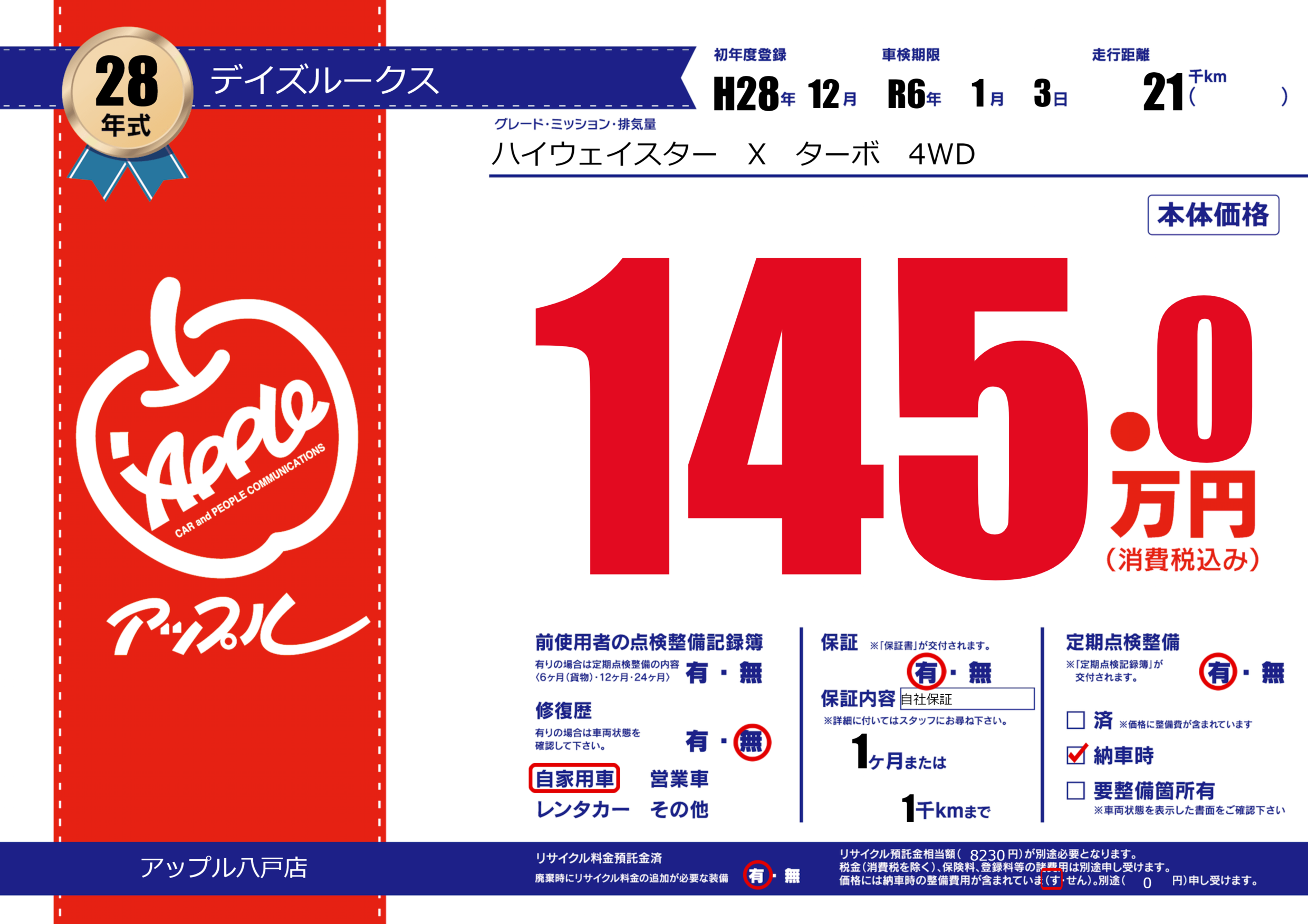 保証付き 保証内容(自社保証) 1ヶ月または1千km |