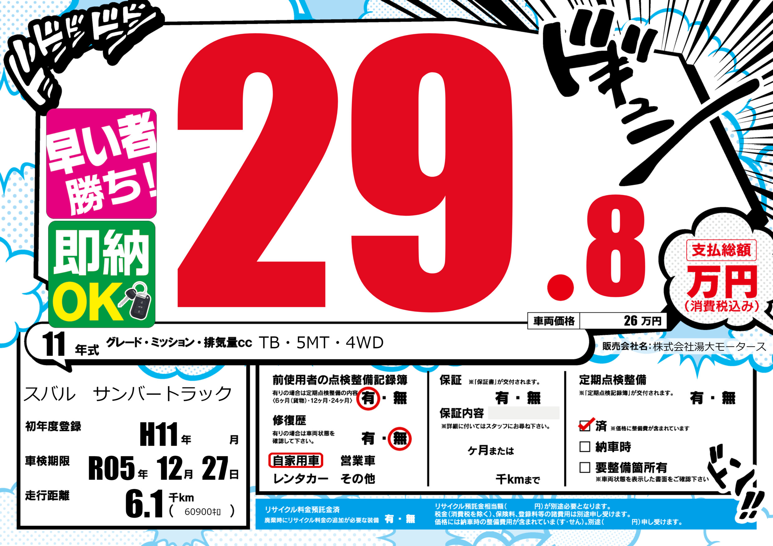 | 走行キロ | 0.6万km | 初年度登録 | H11年---月 |