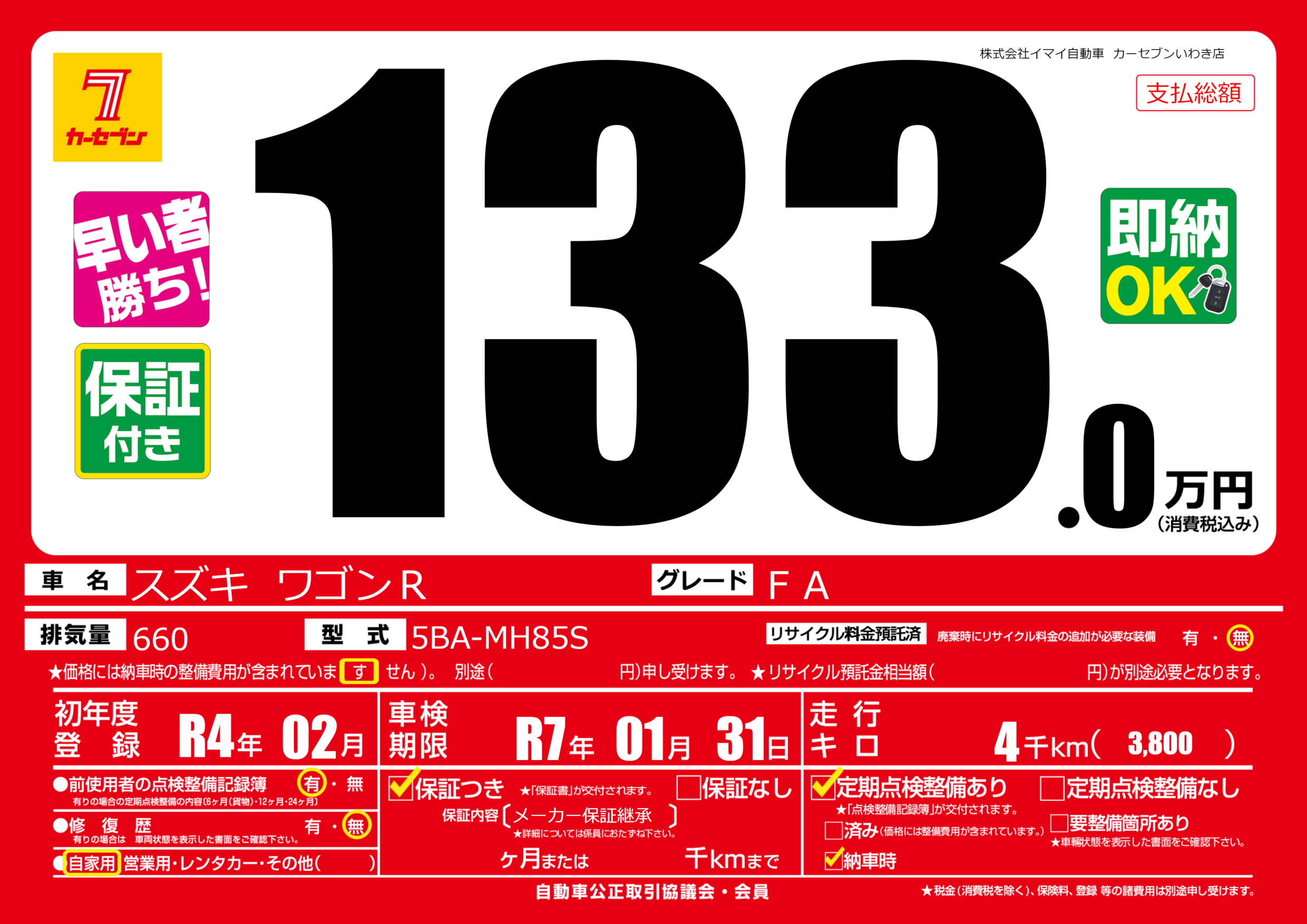 | 車名 | スズキ ワゴンR | グレード ミッション 排気量 |