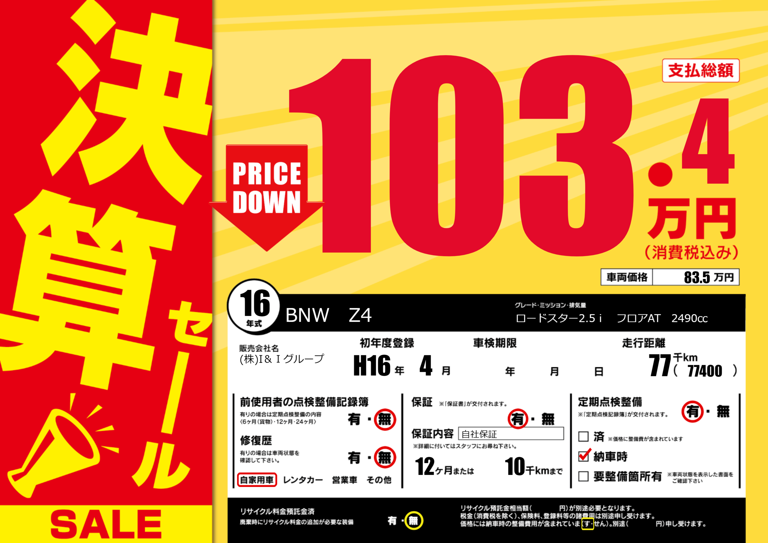 | 車名 | BNW Z4 | グレード ミッション 排気量 |