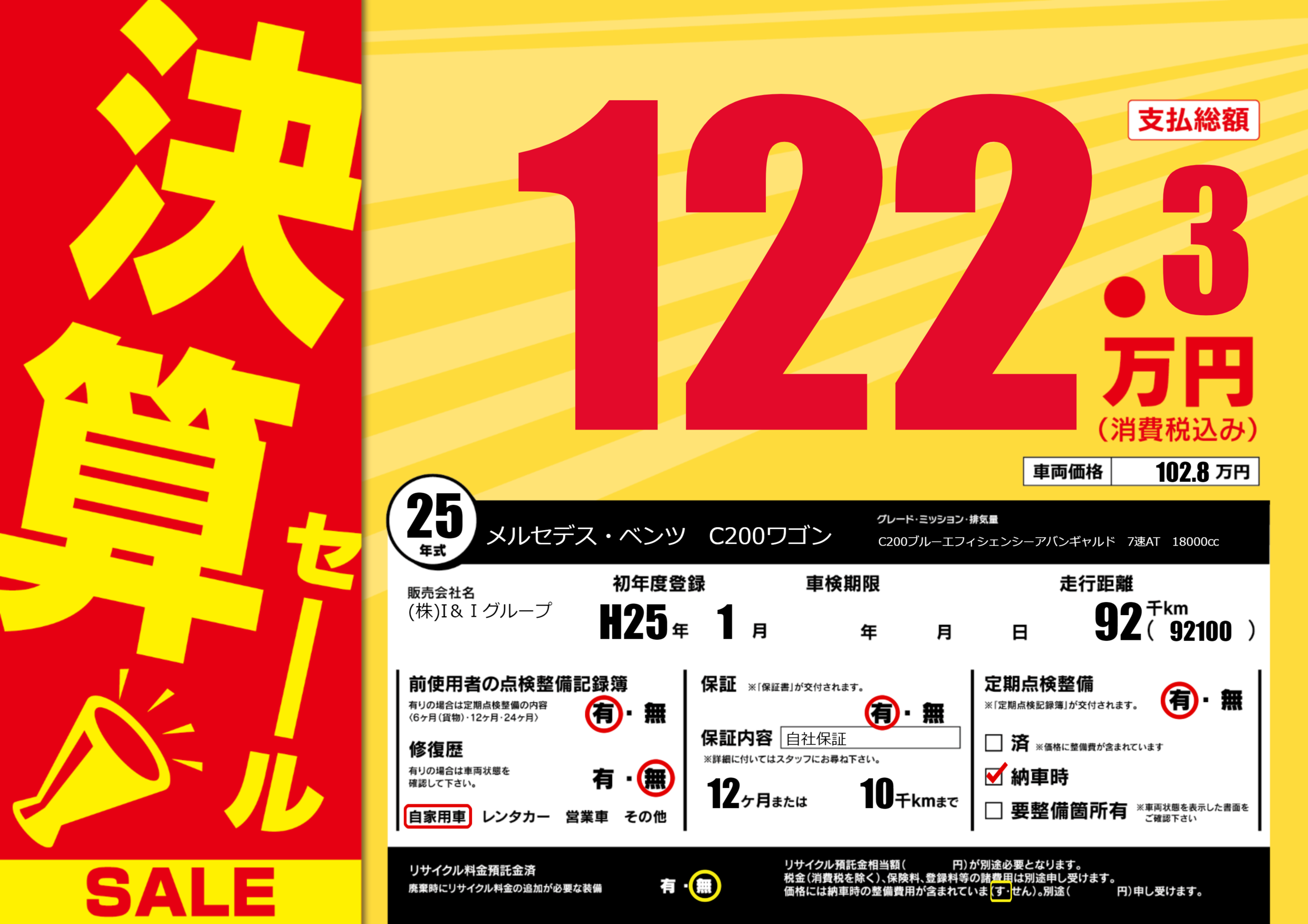 | 車名 | メルセデス・ベンツ C200ワゴン | グレード ミッション 排気量 |