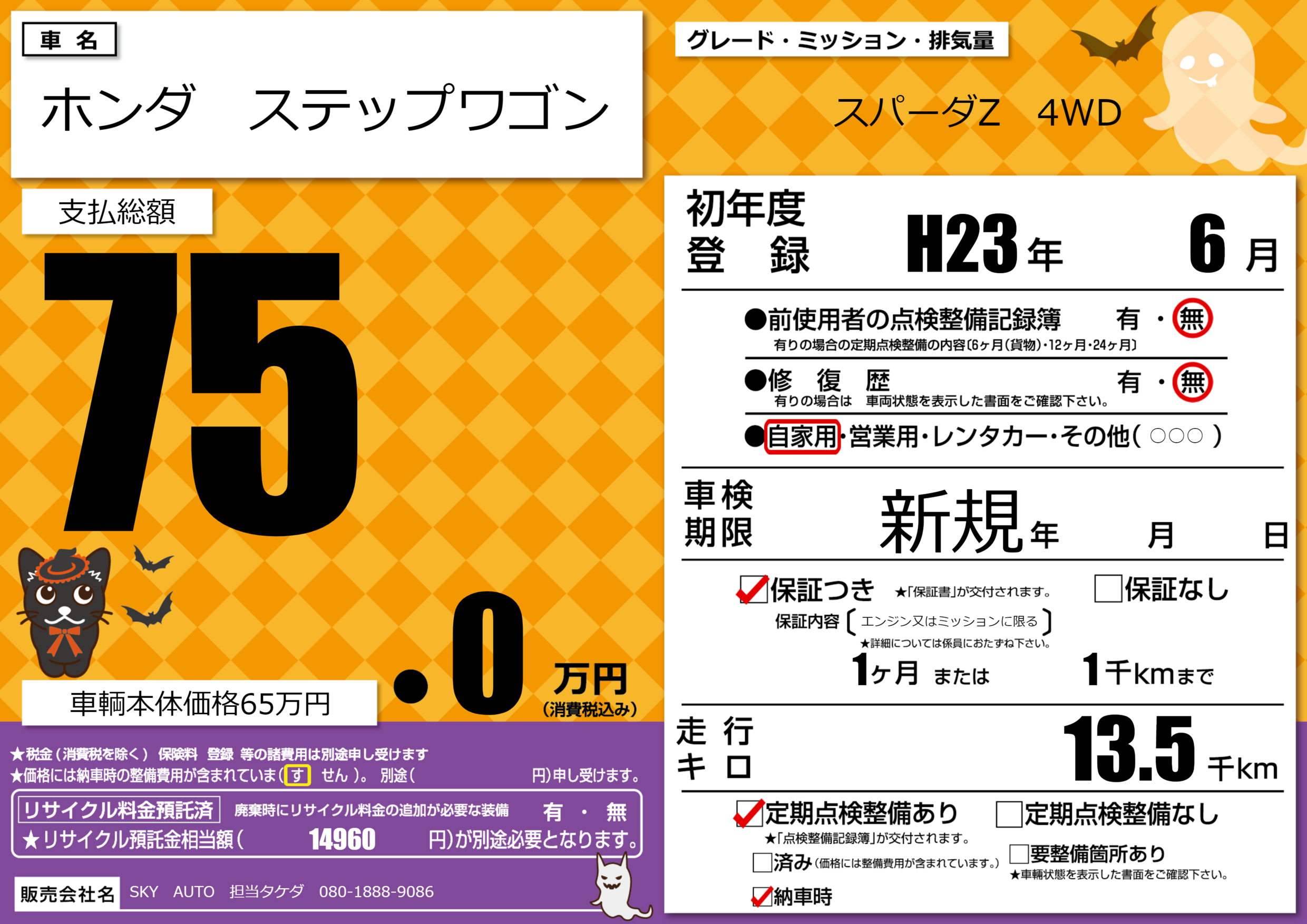 | 走行キロ | 1.3万km | 初年度登録 | H23年6月 |